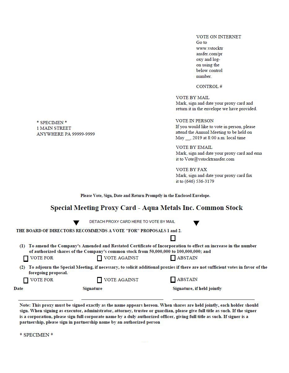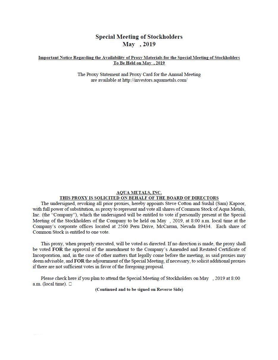 You are cordially invited to attend a special meeting of stockholders (which we refer to as the “Special Meeting”) of Aqua Metals, Inc., a Delaware corporation (which we refer to as “we,” “us,” “our,” or the “Company”), to be held at our corporate offices located at 2500 Peru Drive, McCarran, Nevada 89434, at 8:00 a.m. local time, on ______________, May __, 2019.