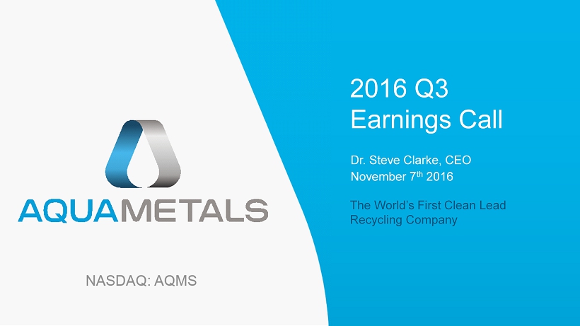 Dr. Steve Clarke, CEO November 7 th 2016 The World’s First Clean Lead Recycling Company 2016 Q3 Earnings Call NASDAQ: AQMS