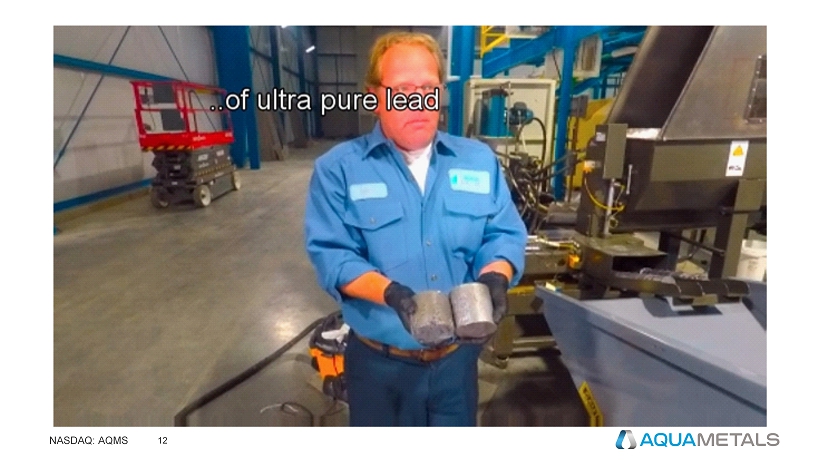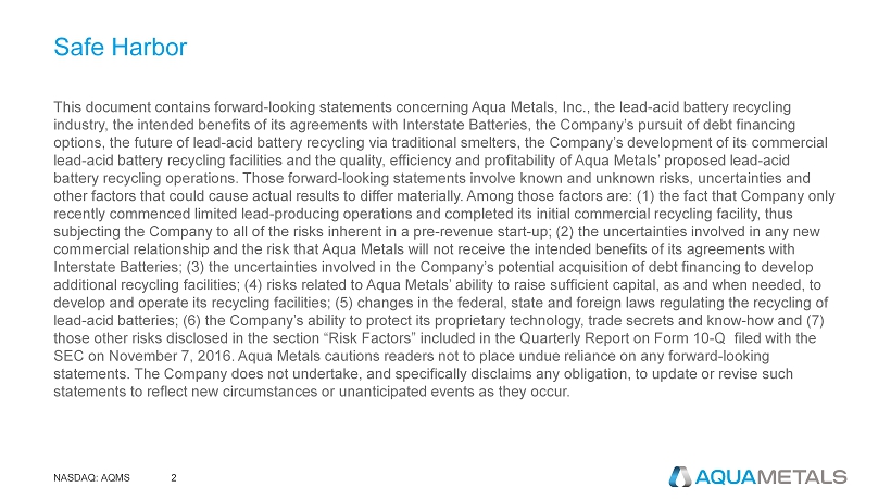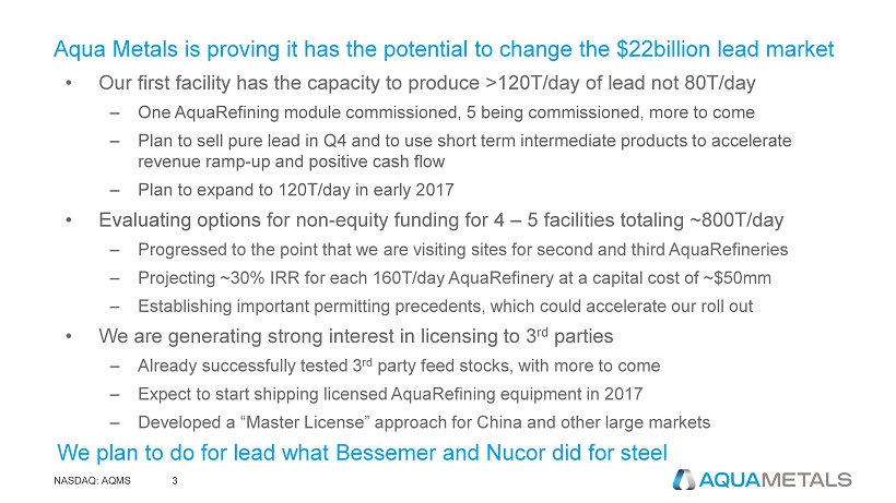 Safe Harbor NASDAQ: AQMS This document contains forward - looking statements concerning Aqua Metals, Inc., the lead - acid battery recycling industry, the intended benefits of its agreements with Interstate Batteries, the Company’s pursuit of debt financing options, the future of lead - acid battery recycling via traditional smelters, the Company’s development of its commercial lead - acid battery recycling facilities and the quality, efficiency and profitability of Aqua Metals’ proposed lead - acid battery recycling operations. Those forward - looking statements involve known and unknown risks, uncertainties and other factors that could cause actual results to differ materially. Among those factors are: (1) the fact that Company only recently commenced limited lead - producing operations and completed its initial commercial recycling facility, thus subjecting the Company to all of the risks inherent in a pre - revenue start - up; (2) the uncertainties involved in any new commercial relationship and the risk that Aqua Metals will not receive the intended benefits of its agreements with Interstate Batteries; (3) the uncertainties involved in the Company’s potential acquisition of debt financing to develop additional recycling facilities; (4) risks related to Aqua Metals’ ability to raise sufficient capital, as and when needed, t o develop and operate its recycling facilities; (5) changes in the federal, state and foreign laws regulating the recycling of lead - acid batteries; (6) the Company’s ability to protect its proprietary technology, trade secrets and know - how and (7) those other risks disclosed in the section “Risk Factors” included in the Quarterly Report on Form 10 - Q filed with the SEC on November 7, 2016. Aqua Metals cautions readers not to place undue reliance on any forward - looking statements. The Company does not undertake, and specifically disclaims any obligation, to update or revise such statements to reflect new circumstances or unanticipated events as they occur. 2