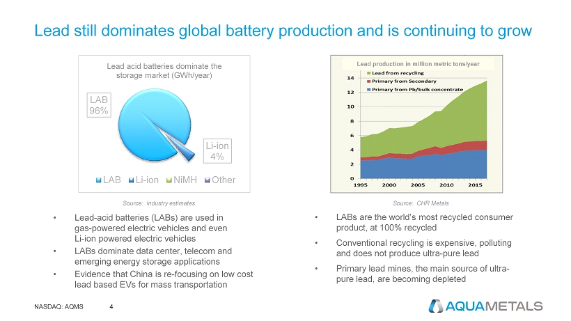 Aqua Metals is proving it has the potential to change the $22billion lead market • Our first facility has the capacity to produce >120T/day of lead not 80T/day – One AquaRefining module commissioned, 5 being commissioned, more to come – Plan to sell pure lead in Q4 and to use short term intermediate products to accelerate revenue ramp - up and positive cash flow – Plan to expand to 120T/day in early 2017 • Evaluating options for non - equity funding for 4 – 5 facilities totaling ~800T/day – Progressed to the point that we are visiting sites for second and third AquaRefineries – Projecting ~30% IRR for each 160T/day AquaRefinery at a capital cost of ~$50mm – Establishing important permitting precedents, which could accelerate our roll out • We are generating strong interest in licensing to 3 rd parties – Already successfully tested 3 rd party feed stocks, with more to come – Expect to start shipping licensed AquaRefining equipment in 2017 – Developed a “Master License” approach for China and other large markets 3 We plan to do for lead what Bessemer and Nucor did for steel NASDAQ: AQMS