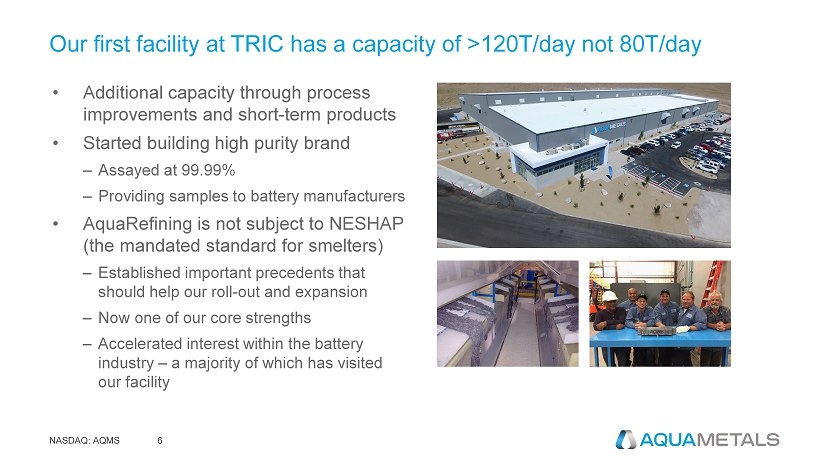 AquaRefining uses less energy, eliminates waste and toxic emissions NASDAQ: AQMS 5 • Only the lead compounds are converted back into lead • High value lead alloys recovered at source and converted directly into ingots • Much less energy required • No opportunity for fugitive emissions • Reduced permitting needs