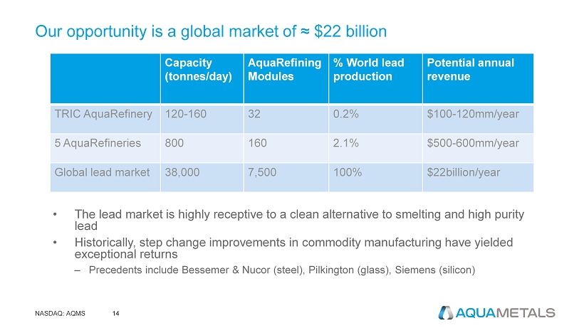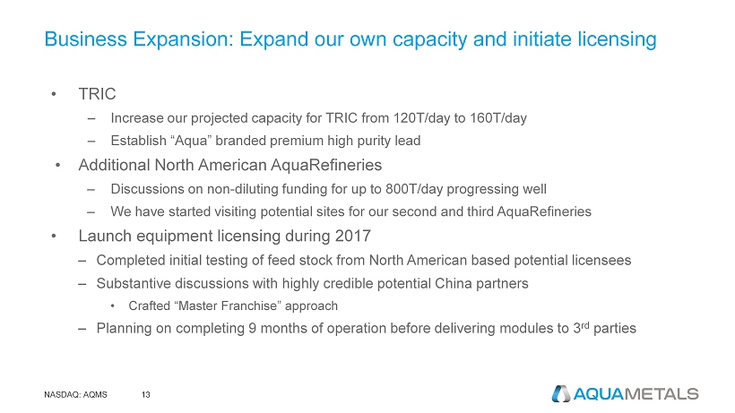 • TRIC – Increase our projected capacity for TRIC from 120T/day to 160T/day – Establish “Aqua” branded premium high purity lead • Additional North American AquaRefineries – Discussions on non - diluting funding for up to 800T/day progressing well – We have started visiting potential sites for our second and third AquaRefineries • Launch equipment licensing during 2017 – Completed initial testing of feed stock from North American based potential licensees – Substantive discussions with highly credible potential China partners • Crafted “Master Franchise” approach – Planning on completing 9 months of operation before delivering modules to 3 rd parties Business Expansion: Expand our own capacity and initiate licensing NASDAQ: AQMS 13