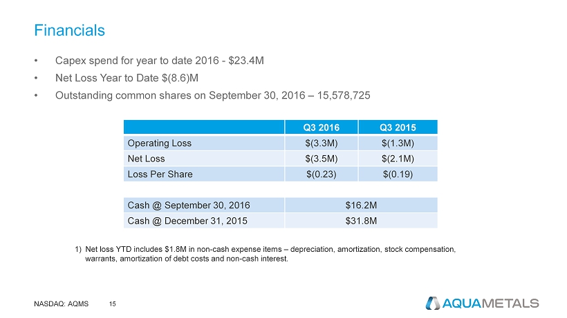 Our opportunity is a global market of ≈ $22 billion NASDAQ: AQMS Capacity (tonnes/day) AquaRefining Modules % World lead production Potential annual revenue TRIC AquaRefinery 120 - 160 32 0.2% $100 - 120mm/year 5 AquaRefineries 800 160 2.1% $500 - 600mm/year Global lead market 38,000 7,500 100% $22billion/year 14 • The lead market is highly receptive to a clean alternative to smelting and high purity lead • Historically, step change improvements in commodity manufacturing have yielded exceptional returns – Precedents include Bessemer & Nucor (steel), Pilkington (glass), Siemens (silicon)