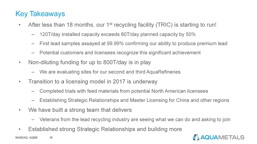 Financials • Capex spend for year to date 2016 - $23.4M • Net Loss Year to Date $(8.6)M • Outstanding common shares on September 30, 2016 – 15,578,725 Q3 2016 Q3 2015 Operating Loss $(3.3M) $(1.3M) Net Loss $(3.5M) $(2.1M) Loss Per Share $(0.23) $(0.19) Cash @ September 30 , 2016 $16.2M Cash @ December 31 , 2015 $31.8M 1) Net loss YTD includes $1.8M in non - cash expense items – depreciation, amortization, stock compensation, warrants, amortization of debt costs and non - cash interest. NASDAQ: AQMS 15