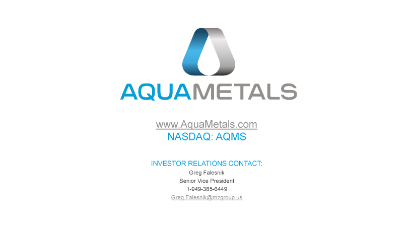 INVESTOR RELATIONS CONTACT: Greg Falesnik Senior Vice President 1 - 949 - 385 - 6449 Greg.Falesnik@mzgroup.us www.AquaMetals.com NASDAQ: AQMS