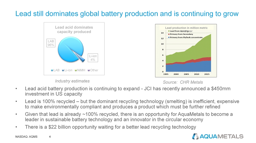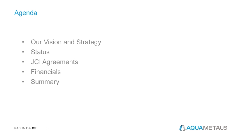 Safe Harbor NASDAQ: AQMS This document contains forward - looking statements concerning Aqua Metals, Inc., the lead - acid battery recycling industry, the intended benefits of its agreements with Johnson Controls and Interstate Batteries, the future of lead - acid battery recycling via traditional smelters, the Company’s development of its commercial lead - acid battery recycling facilities and the quality, efficiency and profitability of Aqua Metals’ proposed lead - acid battery recycling operations. Those forward - looking statements involve known and unknown risks, uncertainties and other factors that could cause actual results to differ materially. Among those factors are: (1) the fact that Company has not yet ramped up its initial commercial recycling facility, to full scale operation thus subjecting the Company to all of the risks inherent in a start - up; (2) the uncertainties involved in any new commercial relationship and the risk that Aqua Metals will not receive the intended benefits of its agreements with Johnson Controls and Interstate Batteries; (3) risks related to Aqua Metals’ ability to raise sufficient capital, as and when needed, to expand its recycling facilities; (4) changes in the federal, stat e and foreign laws regulating the recycling of lead - acid batteries; (5) the Company’s ability to protect its proprietary technology, trade secrets and know - how and (6) these and other risks disclosed in the section “Risk Factors” included in the quarterly report on Form 10 - Q filed with the SEC on November 7, 2016. Aqua Metals cautions readers not to place undue reliance on any forward - looking statements. The Company does not undertake, and specifically disclaims any obligation, to update or revise such statements to reflect new circumstances or unanticipated events as they occur. 2