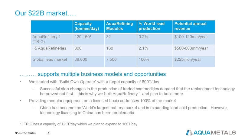 LAB 96% Li - ion 4% Lead acid dominates capacity produced LAB Li-ion NiMH Other Industry estimates Source: CHR Metals Lead production in million metric tons/year Lead still dominates global battery production and is continuing to grow 4 NASDAQ: AQMS • Lead acid battery production is continuing to expand - JCI has recently announced a $450mm investment in US capacity • Lead is 100% recycled – but the dominant recycling technology (smelting) is inefficient, expensive to make environmentally compliant and produces a product which must be further refined • Given that lead is already ~100% recycled, there is an opportunity for AquaMetals to become a leader in sustainable battery technology and an innovator in the circular economy • There is a $22 billion opportunity waiting for a better lead recycling technology