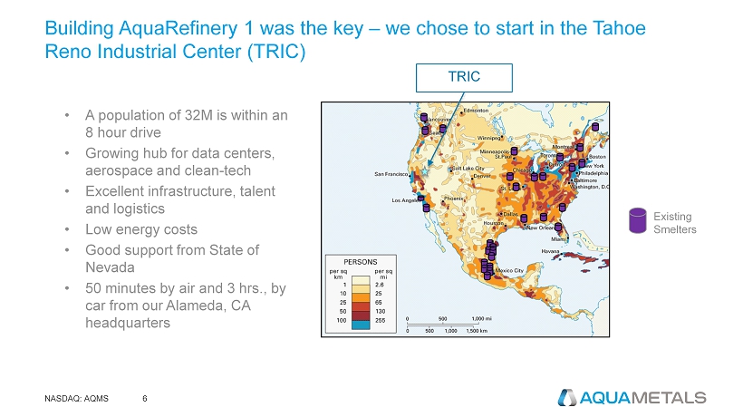 ……… supports multiple business models and opportunities • We started with “Build Own Operate” with a target capacity of 800T/day – Successful step changes in the production of traded commodities demand that the replacement technology be proved out first – this is why we built AquaRefinery 1 and plan to build more • Providing modular equipment on a licensed basis addresses 100% of the market – China has become the World’s largest battery market and is expanding lead acid production. However, technology licensing in China has been problematic Our $22B market…. Capacity (tonnes/day) AquaRefining Modules % World lead production Potential annual revenue AquaRefinery 1 (TRIC) 120 - 160 1 32 0.2% $100 - 120mm/year ~5 AquaRefineries 800 160 2.1% $500 - 600mm/year Global lead market 38,000 7,500 100% $22billion/year 5 NASDAQ: AQMS 1. TRIC has a capacity of 120T/day which we plan to expand to 160T/day