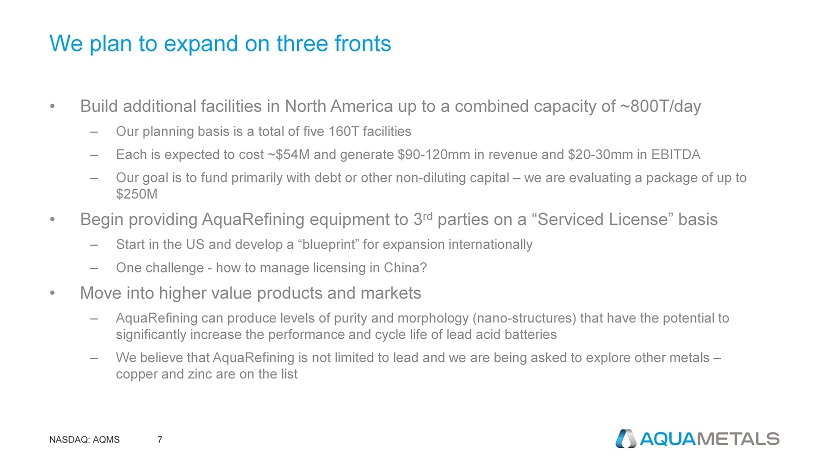 Building AquaRefinery 1 was the key – we chose to start in the Tahoe Reno Industrial Center (TRIC) • A population of 32M is within an 8 hour drive • Growing hub for data centers, aerospace and clean - tech • Excellent infrastructure, talent and logistics • Low energy costs • Good support from State of Nevada • 50 minutes by air and 3 hrs., by car from our Alameda, CA headquarters Existing Smelters TRIC 6 NASDAQ: AQMS