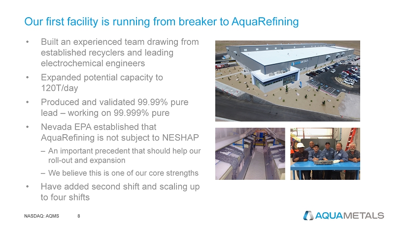 • Build additional facilities in North America up to a combined capacity of ~800T/day – Our planning basis is a total of five 160T facilities – Each is expected to cost ~$54M and generate $90 - 120mm in revenue and $20 - 30mm in EBITDA – Our goal is to fund primarily with debt or other non - diluting capital – we are evaluating a package of up to $250M • Begin providing AquaRefining equipment to 3 rd parties on a “Serviced License” basis – Start in the US and develop a “blueprint” for expansion internationally – One challenge - how to manage licensing in China? • Move into higher value products and markets – AquaRefining can produce levels of purity and morphology (nano - structures) that have the potential to significantly increase the performance and cycle life of lead acid batteries – We believe that AquaRefining is not limited to lead and we are being asked to explore other metals – copper and zinc are on the list We plan to expand on three fronts 7 NASDAQ: AQMS