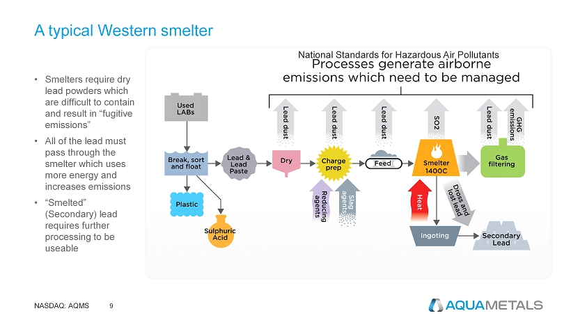 Our first facility is running from breaker to AquaRefining • Built an experienced team drawing from established recyclers and leading electrochemical engineers • Expanded potential capacity to 120T/day • Produced and validated 99.99% pure lead – working on 99.999% pure • Nevada EPA established that AquaRefining is not subject to NESHAP – An important precedent that should help our roll - out and expansion – We believe this is one of our core strengths • Have added second shift and scaling up to four shifts NASDAQ: AQMS 8