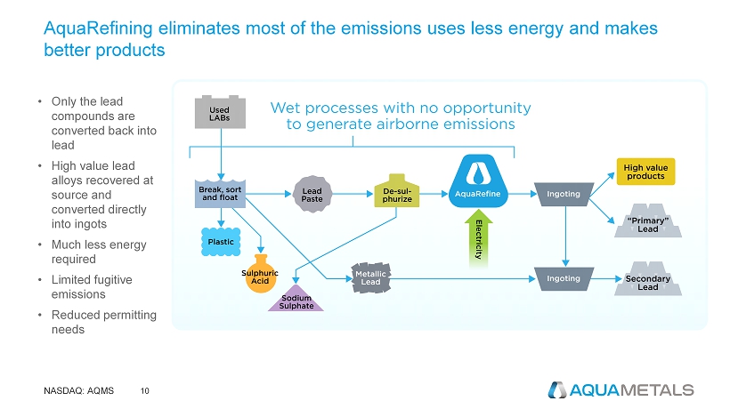 A typical Western smelter • Smelters require dry lead powders which are difficult to contain and result in “fugitive emissions” • All of the lead must pass through the smelter which uses more energy and increases emissions • “Smelted” (Secondary) lead requires further processing to be useable NASDAQ: AQMS 9 National Standards for Hazardous Air Pollutants