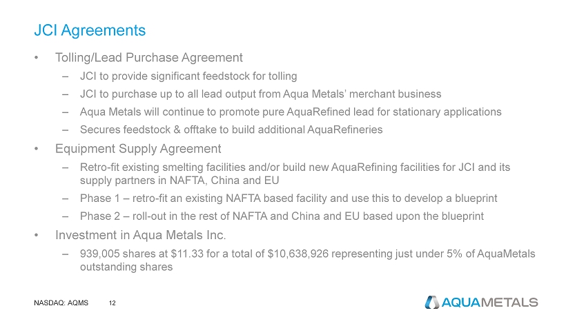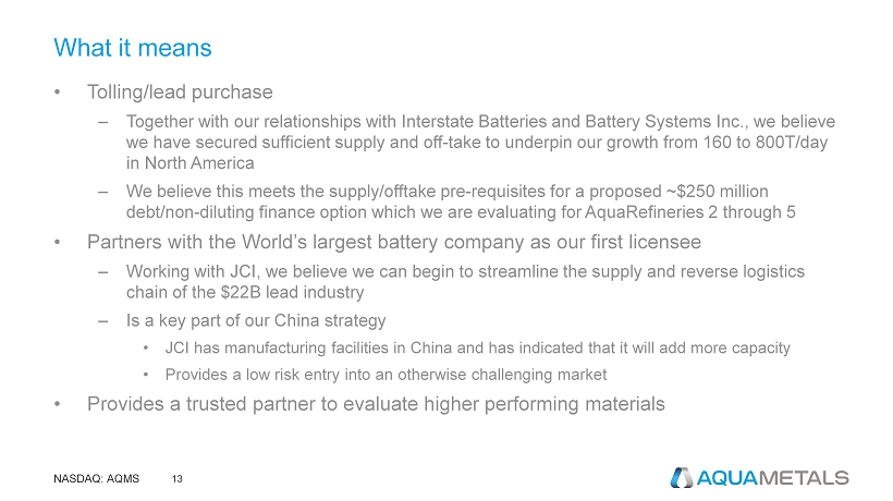 JCI Agreements • Tolling/Lead Purchase Agreement – JCI to provide significant feedstock for tolling – JCI to purchase up to all lead output from Aqua Metals’ merchant business – Aqua Metals will continue to promote pure AquaRefined lead for stationary applications – Secures feedstock & offtake to build additional AquaRefineries • Equipment Supply Agreement – Retro - fit existing smelting facilities and/or build new AquaRefining facilities for JCI and its supply partners in NAFTA, China and EU – Phase 1 – retro - fit an existing NAFTA based facility and use this to develop a blueprint – Phase 2 – roll - out in the rest of NAFTA and China and EU based upon the blueprint • Investment in Aqua Metals Inc. – 939,005 shares at $11.33 for a total of $10,638,926 representing just under 5% of AquaMetals outstanding shares NASDAQ: AQMS 12