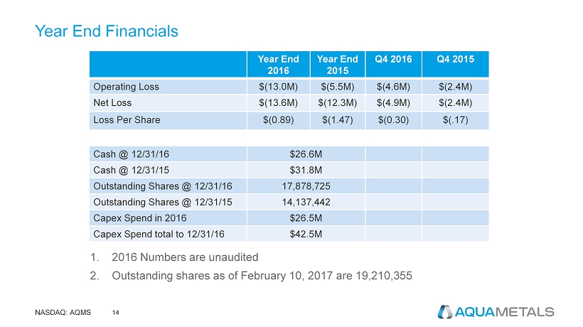 What it means • Tolling/lead purchase – Together with our relationships with Interstate Batteries and Battery Systems Inc., we believe we have secured sufficient supply and off - take to underpin our growth from 160 to 800T/day in North America – We believe this meets the supply/offtake pre - requisites for a proposed ~$250 million debt/non - diluting finance option which we are evaluating for AquaRefineries 2 through 5 • Partners with the World’s largest battery company as our first licensee – Working with JCI, we believe we can begin to streamline the supply and reverse logistics chain of the $22B lead industry – Is a key part of our China strategy • JCI has manufacturing facilities in China and has indicated that it will add more capacity • Provides a low risk entry into an otherwise challenging market • Provides a trusted partner to evaluate higher performing materials NASDAQ: AQMS 13