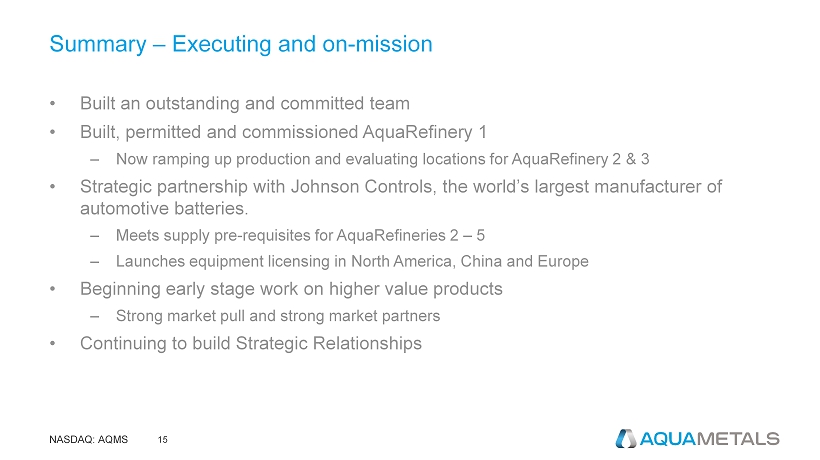 Year End Financials 1. 2016 Numbers are unaudited 2. Outstanding shares as of February 10, 2017 are 19,210,355 NASDAQ: AQMS 14 Year End 2016 Year End 2015 Q4 2016 Q4 2015 Operating Loss $(13.0M) $(5.5M) $(4.6M) $(2.4M) Net Loss $(13.6M) $(12.3M) $(4.9M) $(2.4M) Loss Per Share $(0.89) $(1.47) $(0.30) $(.17) Cash @ 12/31/16 $26.6M Cash @ 12/31/15 $31.8M Outstanding Shares @ 12/31/16 17,878,725 Outstanding Shares @ 12/31/15 14,137,442 Capex Spend in 2016 $26.5M Capex Spend total to 12/31/16 $42.5M