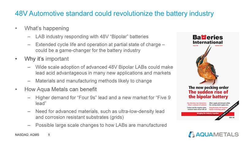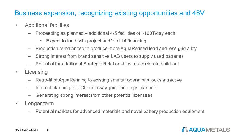 48V Automotive standard could revolutionize the battery industry • What’s happening – LAB industry responding with 48V “Bipolar” batteries – Extended cycle life and operation at partial state of charge – could be a game - changer for the battery industry • Why it’s important – Wide scale adoption of advanced 48V Bipolar LABs could make lead acid advantageous in many new applications and markets – Materials and manufacturing methods likely to change • How Aqua Metals can benefit – Higher demand for “Four 9s” lead and a new market for “Five 9 lead” – Need for advanced materials, such as ultra - low - density lead and corrosion resistant substrates (grids) – Possible large scale changes to how LABs are manufactured NASDAQ: AQMS 9