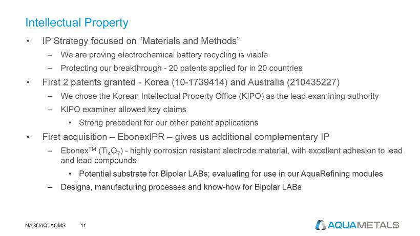 Business expansion, recognizing existing opportunities and 48V • Additional facilities – Proceeding as planned – additional 4 - 5 facilities of ~160T/day each • Expect to fund with project and/or debt financing – Production re - balanced to produce more AquaRefined lead and less grid alloy – Strong interest from brand sensitive LAB users to supply used batteries – Potential for additional Strategic Relationships to accelerate build - out • Licensing – Retro - fit of AquaRefining to existing smelter operations looks attractive – Internal planning for JCI underway, joint meetings planned – Generating strong interest from other potential licensees • Longer term – Potential markets for advanced materials and novel battery production equipment NASDAQ: AQMS 10