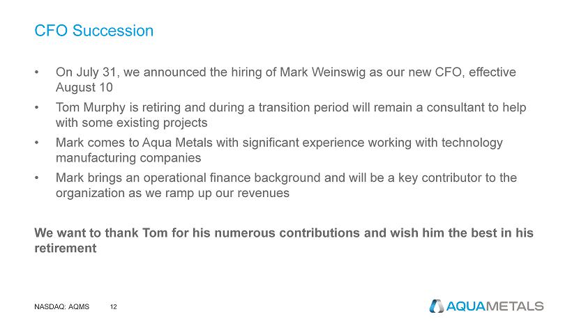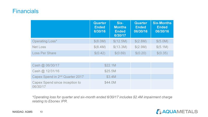 CFO Succession NASDAQ: AQMS 12 • On July 31, we announced the hiring of Mark Weinswig as our new CFO, effective August 10 • Tom Murphy is retiring and during a transition period will remain a consultant to help with some existing projects • Mark comes to Aqua Metals with significant experience working with technology manufacturing companies • Mark brings an operational finance background and will be a key contributor to the organization as we ramp up our revenues We want to thank Tom for his numerous contributions and wish him the best in his retirement