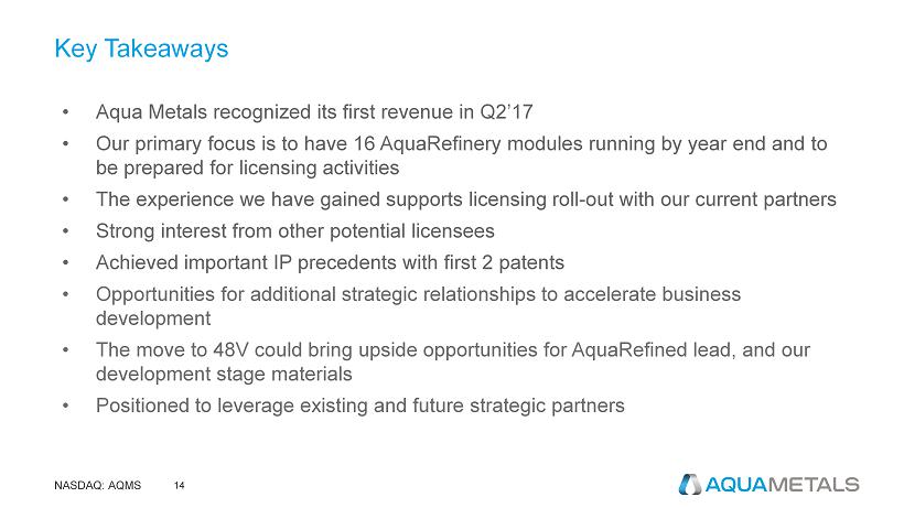 *Operating loss for quarter and six - month ended 6/30/17 includes $2.4M impairment charge relating to Ebonex IPR. NASDAQ: AQMS 13 Quarter Ended 6/30/16 Six - Months Ended 6/30/17 Quarter Ended 06/30/16 Six - Months Ended 06/30/16 Operating Loss* $(8.0M) $(12.5M) $(2.8M) $(5.0M) Net Loss $(8.4M) $(13.3M) $(2.9M) $(5.1M) Loss Per Share $(0.42) $(0.69) $(0.20) $(0.35) Cash @ 06/30/17 $22.1M Cash @ 12/31/16 $25.5M Capex Spend in 2 nd Quarter 2017 $3.4M Capex Spend since inception to 06/30/17 $44.0M Financials