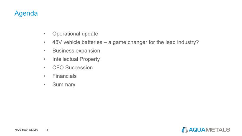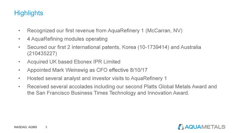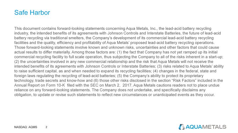 Safe Harbor NASDAQ: AQMS This document contains forward - looking statements concerning Aqua Metals, Inc., the lead - acid battery recycling industry, the intended benefits of its agreements with Johnson Controls and Interstate Batteries, the future of lead - acid battery recycling via traditional smelters, the Company’s development of its commercial lead - acid battery recycling facilities and the quality, efficiency and profitability of Aqua Metals’ proposed lead - acid battery recycling operations. Those forward - looking statements involve known and unknown risks, uncertainties and other factors that could cause actual results to differ materially. Among those factors are: (1) the fact that Company has not yet ramped up its initial commercial recycling facility to full scale operation, thus subjecting the Company to all of the risks inherent in a start - up; (2) the uncertainties involved in any new commercial relationship and the risk that Aqua Metals will not receive the intended benefits of its agreements with Johnson Controls or Interstate Batteries; (3) risks related to Aqua Metals’ ability to raise sufficient capital, as and when needed to expand its recycling facilities; (4) changes in the federal, state and foreign laws regulating the recycling of lead - acid batteries; (5) the Company’s ability to protect its proprietary technology, trade secrets and know - how and (6) those other risks disclosed in the section “Risk Factors” included in the Annual Report on Form 10 - K filed with the SEC on March 2, 2017. Aqua Metals cautions readers not to place undue reliance on any forward - looking statements. The Company does not undertake, and specifically disclaims any obligation, to update or revise such statements to reflect new circumstances or unanticipated events as they occur. 2