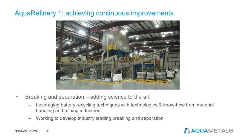 Operational update – preparing for roll - out • Breaking and Separation: operational – Improvements installed and successful – More opportunities in front of us • Aqua Preparation: operational – Upgrades installed and successful – More upgrades being evaluated • Aqua Refining: Module 1 – 4 operational, Modules 5 - 16 in assembly – Modules 1 - 4 being used to validate operating parameters – Modules 5 - 16 planned to be running by year end • Ingot production: being commissioned NASDAQ: AQMS 5