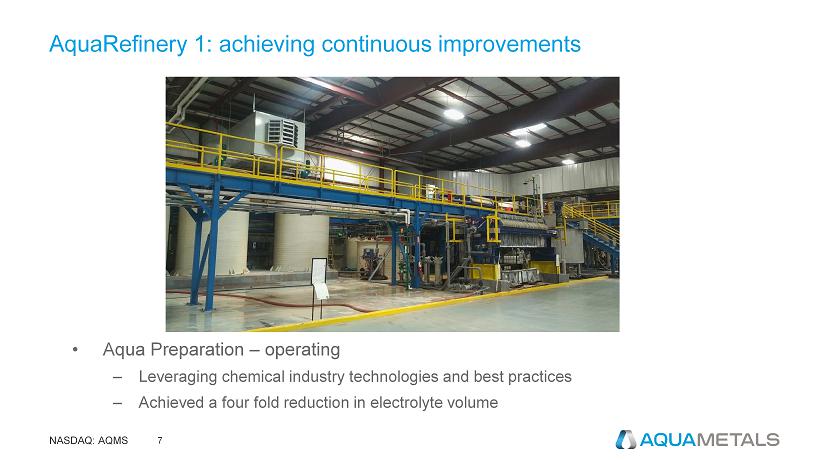 AquaRefinery 1: achieving continuous improvements • Breaking and separation – adding science to the art – Leveraging battery recycling techniques with technologies & know - how from material handling and mining industries – Working to develop industry leading breaking and separation NASDAQ: AQMS 6