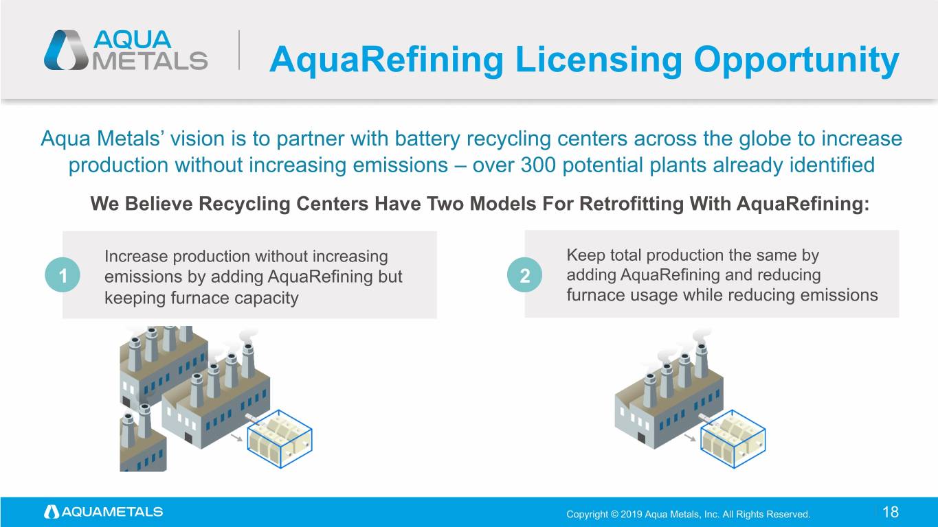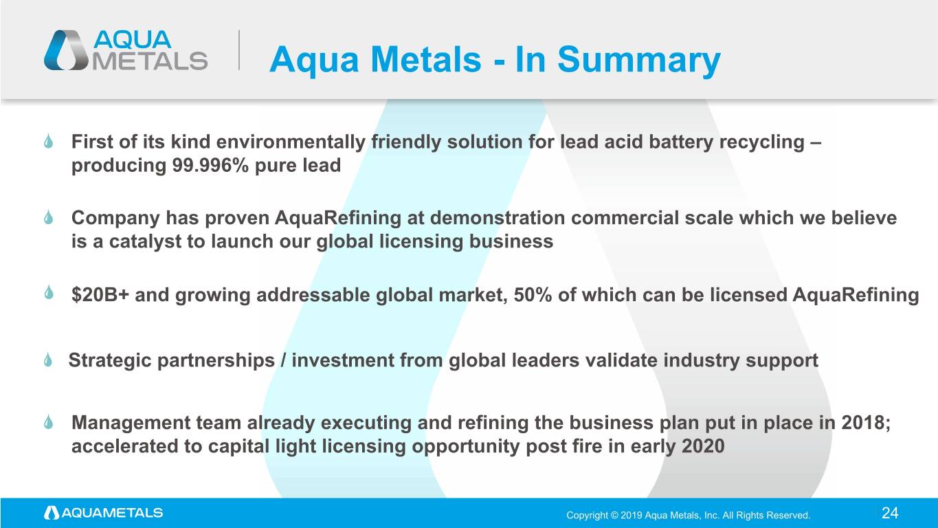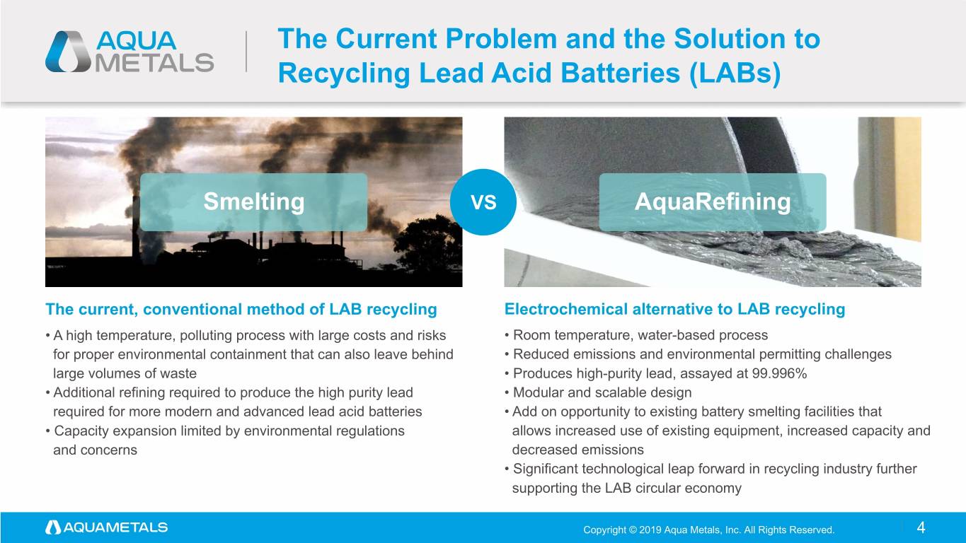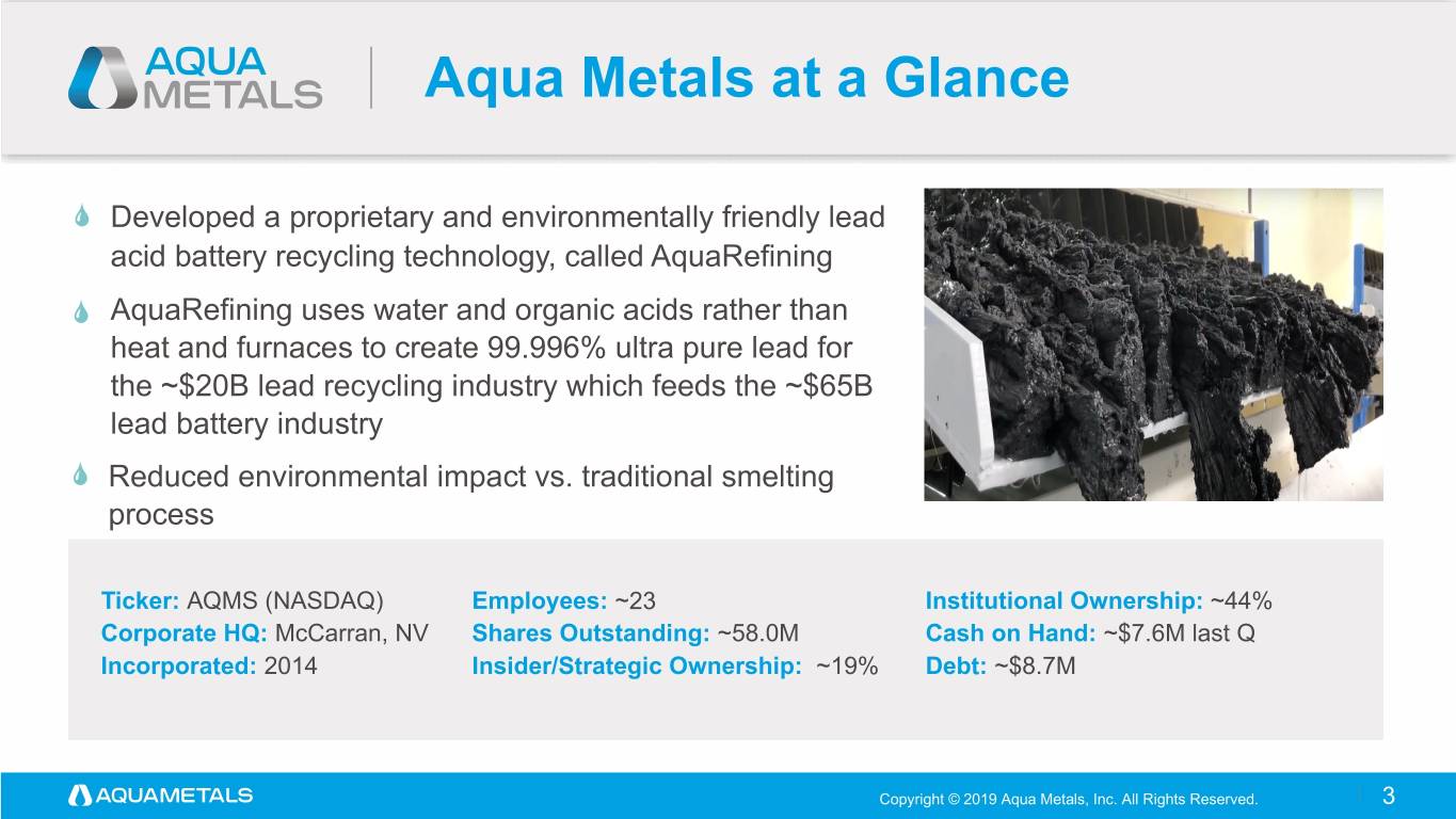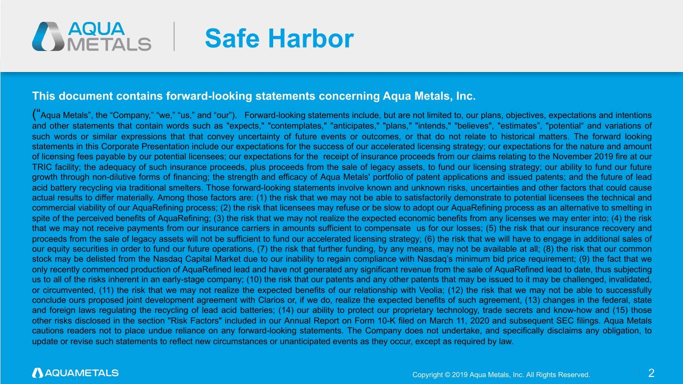 Safe Harbor This document contains forward-looking statements concerning Aqua Metals, Inc. (“Aqua Metals”, the “Company,” “we,” “us,” and “our”). Forward-looking statements include, but are not limited to, our plans, objectives, expectations and intentions and other statements that contain words such as "expects," "contemplates," "anticipates," "plans," "intends," "believes", "estimates”, "potential“ and variations of such words or similar expressions that that convey uncertainty of future events or outcomes, or that do not relate to historical matters. The forward looking statements in this Corporate Presentation include our expectations for the success of our accelerated licensing strategy; our expectations for the nature and amount of licensing fees payable by our potential licensees; our expectations for the receipt of insurance proceeds from our claims relating to the November 2019 fire at our TRIC facility; the adequacy of such insurance proceeds, plus proceeds from the sale of legacy assets, to fund our licensing strategy; our ability to fund our future growth through non-dilutive forms of financing; the strength and efficacy of Aqua Metals' portfolio of patent applications and issued patents; and the future of lead acid battery recycling via traditional smelters. Those forward-looking statements involve known and unknown risks, uncertainties and other factors that could cause actual results to differ materially. Among those factors are: (1) the risk that we may not be able to satisfactorily demonstrate to potential licensees the technical and commercial viability of our AquaRefining process; (2) the risk that licensees may refuse or be slow to adopt our AquaRefining process as an alternative to smelting in spite of the perceived benefits of AquaRefining; (3) the risk that we may not realize the expected economic benefits from any licenses we may enter into; (4) the risk that we may not receive payments from our insurance carriers in amounts sufficient to compensate us for our losses; (5) the risk that our insurance recovery and proceeds from the sale of legacy assets will not be sufficient to fund our accelerated licensing strategy; (6) the risk that we will have to engage in additional sales of our equity securities in order to fund our future operations, (7) the risk that further funding, by any means, may not be available at all; (8) the risk that our common stock may be delisted from the Nasdaq Capital Market due to our inability to regain compliance with Nasdaq’s minimum bid price requirement; (9) the fact that we only recently commenced production of AquaRefined lead and have not generated any significant revenue from the sale of AquaRefined lead to date, thus subjecting us to all of the risks inherent in an early-stage company; (10) the risk that our patents and any other patents that may be issued to it may be challenged, invalidated, or circumvented, (11) the risk that we may not realize the expected benefits of our relationship with Veolia; (12) the risk that we may not be able to successfully conclude ours proposed joint development agreement with Clarios or, if we do, realize the expected benefits of such agreement, (13) changes in the federal, state and foreign laws regulating the recycling of lead acid batteries; (14) our ability to protect our proprietary technology, trade secrets and know-how and (15) those other risks disclosed in the section "Risk Factors" included in our Annual Report on Form 10-K filed on March 11, 2020 and subsequent SEC filings. Aqua Metals cautions readers not to place undue reliance on any forward-looking statements. The Company does not undertake, and specifically disclaims any obligation, to update or revise such statements to reflect new circumstances or unanticipated events as they occur, except as required by law. Copyright © 2019 Aqua Metals, Inc. All Rights Reserved. 2