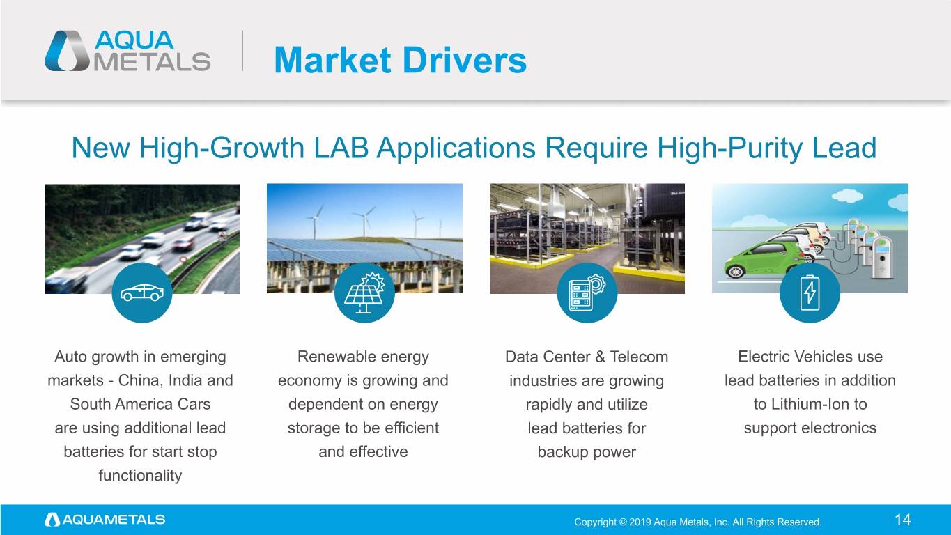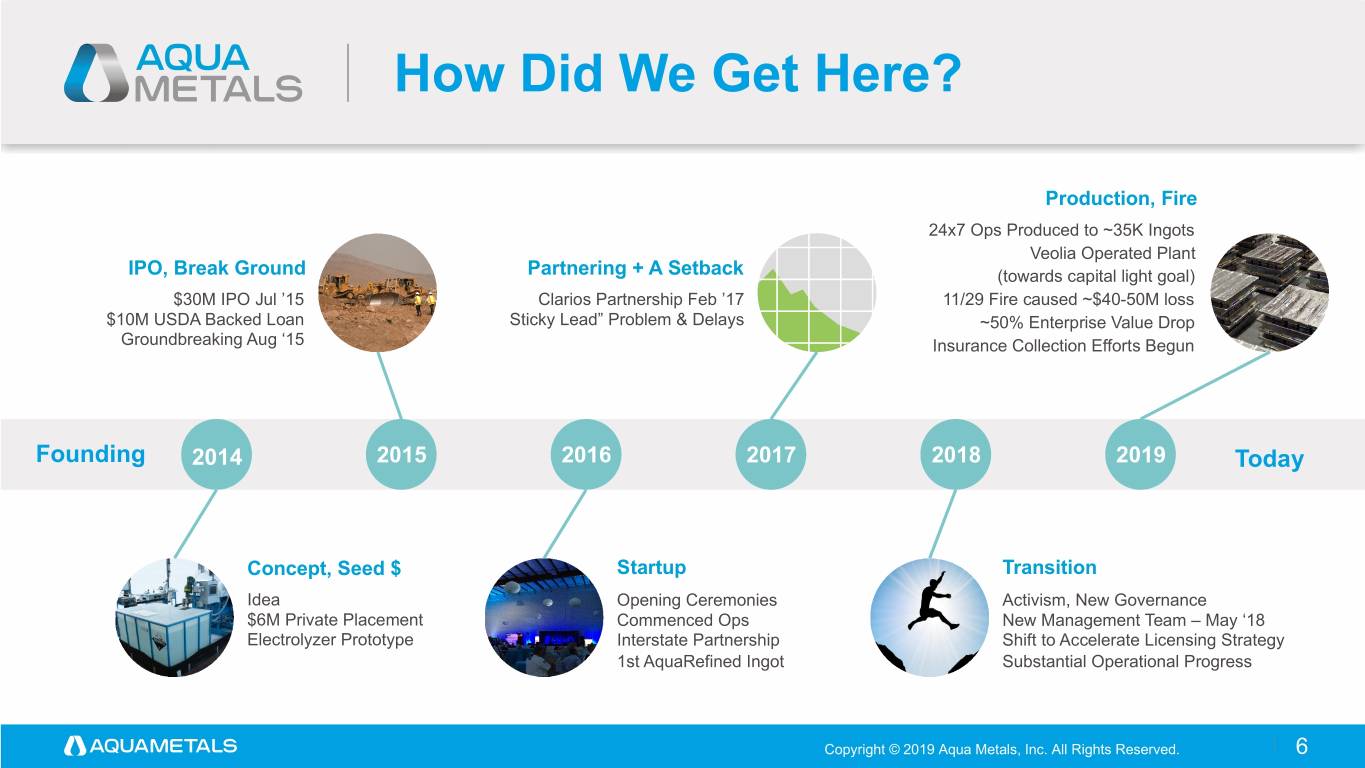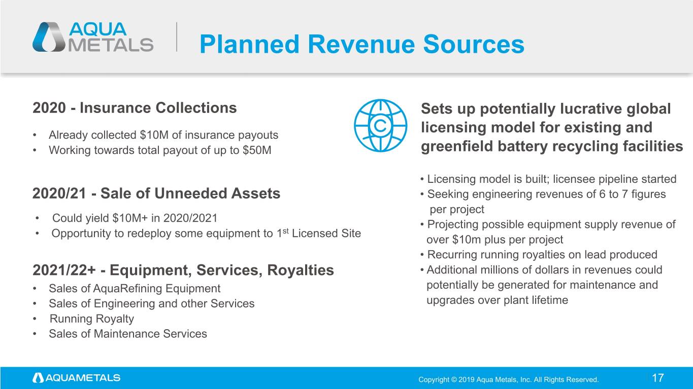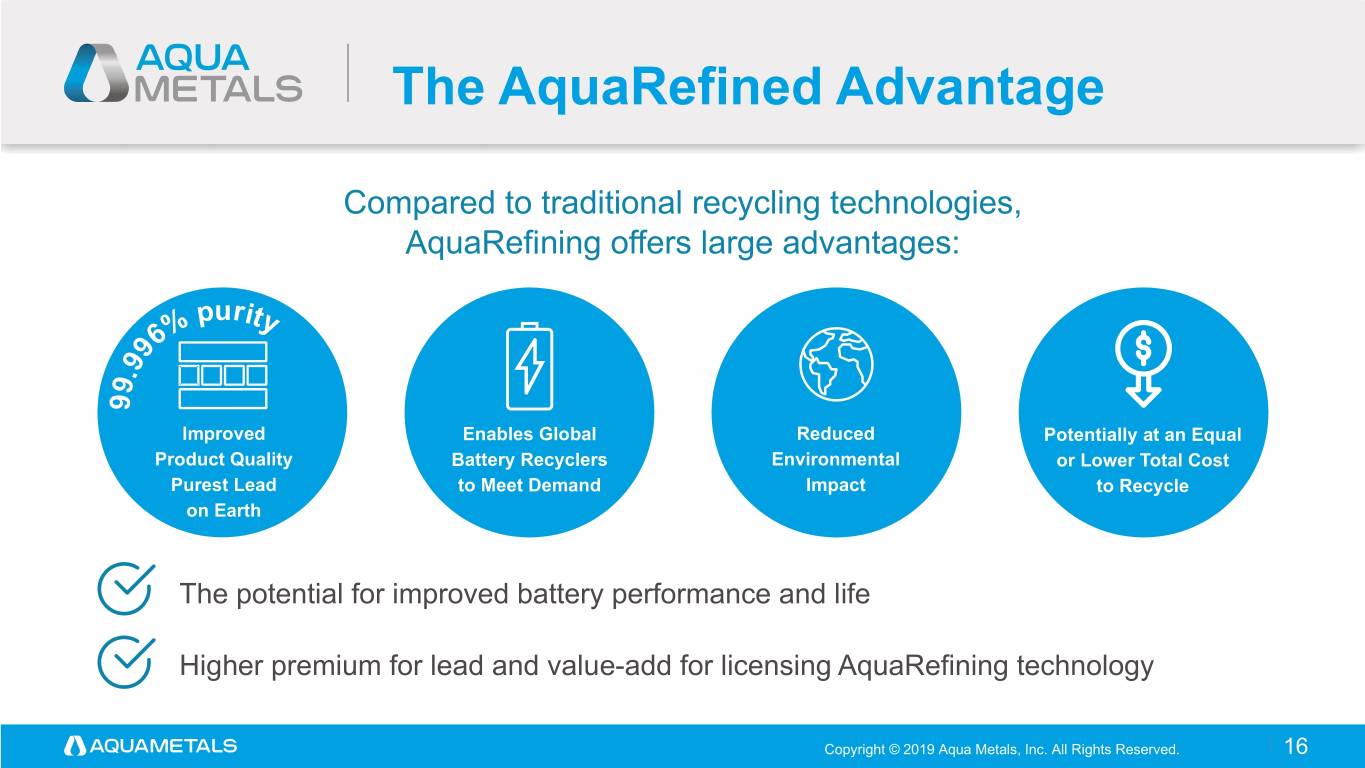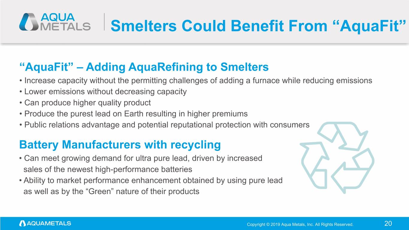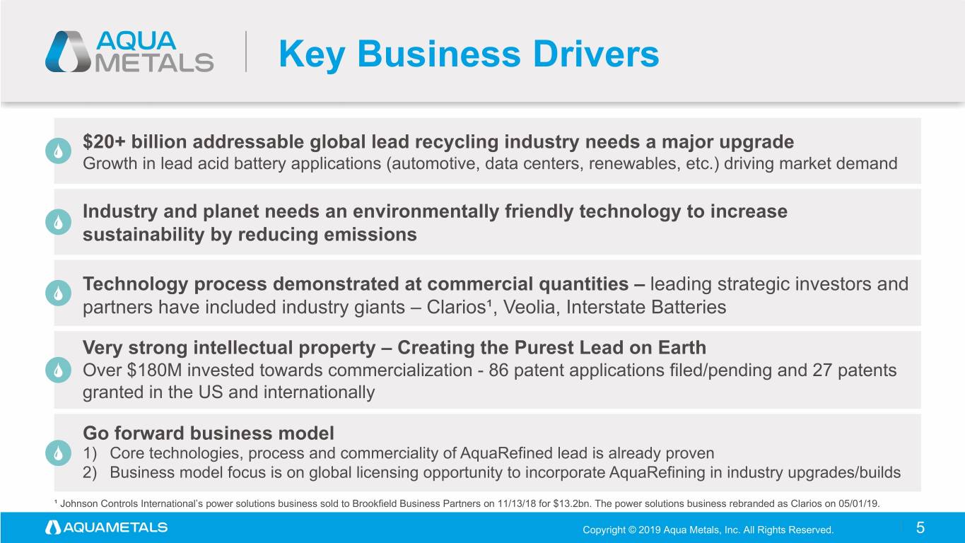Safe Harbor This document contains forward-looking statements concerning Aqua Metals, Inc. (“Aqua Metals”, the “Company,” “we,” “us,” and “our”). Forward-looking statements include, but are not limited to, our plans, objectives, expectations and intentions and other statements that contain words such as "expects," "contemplates," "anticipates," "plans," "intends," "believes", "estimates”, "potential“ and variations of such words or similar expressions that that convey uncertainty of future events or outcomes, or that do not relate to historical matters. The forward looking statements in this Corporate Presentation include our expectations for the success of our accelerated licensing strategy; our expectations for the nature and amount of licensing fees payable by our potential licensees; our expectations for the receipt of insurance proceeds from our claims relating to the November 2019 fire at our TRIC facility; the adequacy of such insurance proceeds, plus proceeds from the sale of legacy assets, to fund our licensing strategy; our ability to fund our future growth through non-dilutive forms of financing; the strength and efficacy of Aqua Metals' portfolio of patent applications and issued patents; and the future of lead acid battery recycling via traditional smelters. Those forward-looking statements involve known and unknown risks, uncertainties and other factors that could cause actual results to differ materially. Among those factors are: (1) the risk that we may not be able to satisfactorily demonstrate to potential licensees the technical and commercial viability of our AquaRefining process; (2) the risk that licensees may refuse or be slow to adopt our AquaRefining process as an alternative to smelting in spite of the perceived benefits of AquaRefining; (3) the risk that we may not realize the expected economic benefits from any licenses we may enter into; (4) the risk that we may not receive payments from our insurance carriers in amounts sufficient to compensate us for our losses; (5) the risk that our insurance recovery and proceeds from the sale of legacy assets will not be sufficient to fund our accelerated licensing strategy; (6) the risk that we will have to engage in additional sales of our equity securities in order to fund our future operations, (7) the risk that further funding, by any means, may not be available at all; (8) the risk that our common stock may be delisted from the Nasdaq Capital Market due to our inability to regain compliance with Nasdaq’s minimum bid price requirement; (9) the fact that we only recently commenced production of AquaRefined lead and have not generated any significant revenue from the sale of AquaRefined lead to date, thus subjecting us to all of the risks inherent in an early-stage company; (10) the risk that our patents and any other patents that may be issued to it may be challenged, invalidated, or circumvented, (11) the risk that we may not realize the expected benefits of our relationship with Veolia; (12) the risk that we may not be able to successfully conclude ours proposed joint development agreement with Clarios or, if we do, realize the expected benefits of such agreement, (13) changes in the federal, state and foreign laws regulating the recycling of lead acid batteries; (14) our ability to protect our proprietary technology, trade secrets and know-how and (15) those other risks disclosed in the section "Risk Factors" included in our Annual Report on Form 10-K filed on March 11, 2020 and subsequent SEC filings. Aqua Metals cautions readers not to place undue reliance on any forward-looking statements. The Company does not undertake, and specifically disclaims any obligation, to update or revise such statements to reflect new circumstances or unanticipated events as they occur, except as required by law. Copyright © 2019 Aqua Metals, Inc. All Rights Reserved. 2