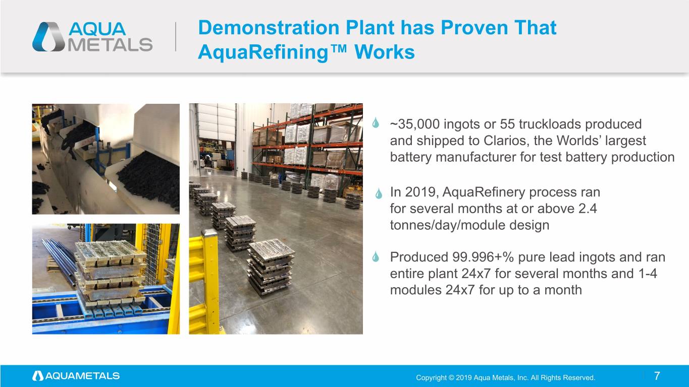 How Did We Get Here? Production, Fire 24x7 Ops Produced to ~35K Ingots Veolia Operated Plant IPO, Break Ground Partnering + A Setback (towards capital light goal) $30M IPO Jul ’15 Clarios Partnership Feb ’17 11/29 Fire caused ~$40-50M loss $10M USDA Backed Loan Sticky Lead” Problem & Delays ~50% Enterprise Value Drop Groundbreaking Aug ‘15 Insurance Collection Efforts Begun Founding 2014 Today Concept, Seed $ Startup Transition Idea Opening Ceremonies Activism, New Governance $6M Private Placement Commenced Ops New Management Team – May ‘18 Electrolyzer Prototype Interstate Partnership Shift to Accelerate Licensing Strategy 1st AquaRefined Ingot Substantial Operational Progress Copyright © 2019 Aqua Metals, Inc. All Rights Reserved. 6