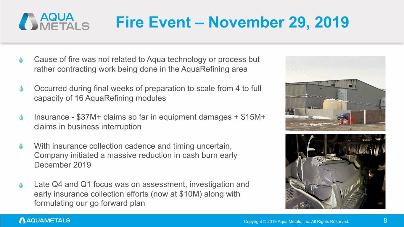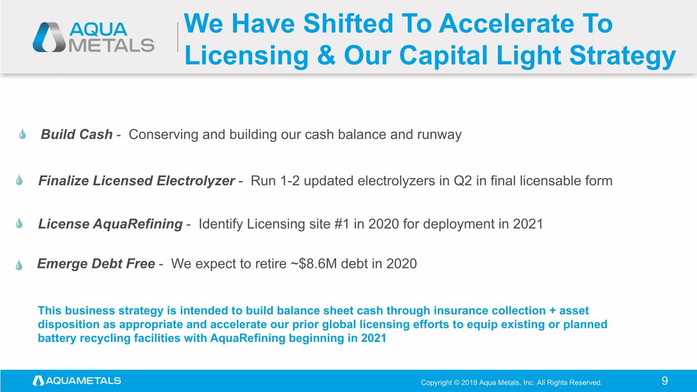 Fire Event – November 29, 2019 Cause of fire was not related to Aqua technology or process but rather contracting work being done in the AquaRefining area Occurred during final weeks of preparation to scale from 4 to full capacity of 16 AquaRefining modules Insurance - $37M+ claims so far in equipment damages + $15M+ claims in business interruption With insurance collection cadence and timing uncertain, Company initiated a massive reduction in cash burn early December 2019 Late Q4 and Q1 focus was on assessment, investigation and early insurance collection efforts (now at $10M) along with formulating our go forward plan Copyright © 2019 Aqua Metals, Inc. All Rights Reserved. 8
