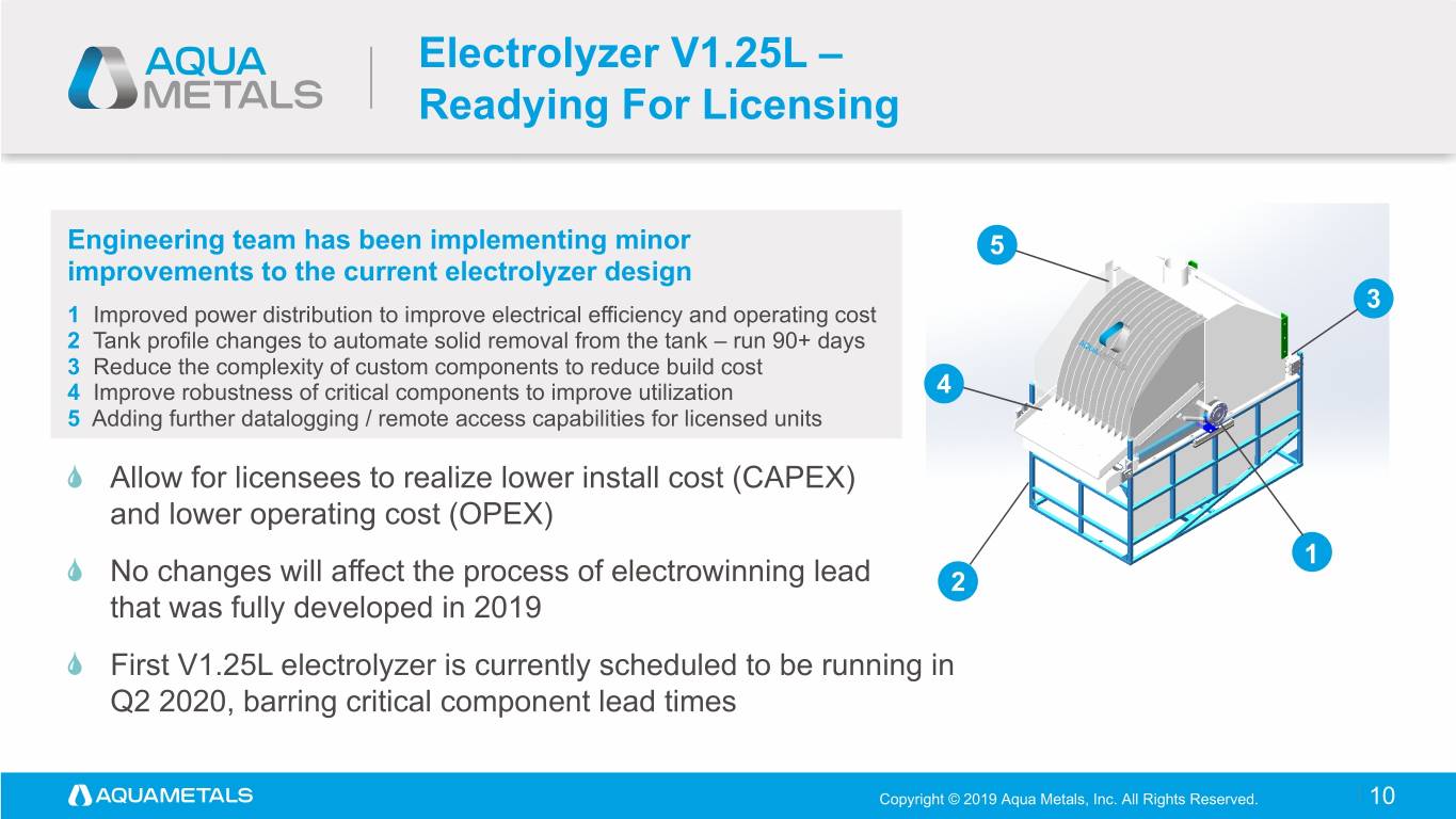 We Have Shifted To Accelerate To Licensing & Our Capital Light Strategy Build Cash - Conserving and building our cash balance and runway Finalize Licensed Electrolyzer - Run 1-2 updated electrolyzers in Q2 in final licensable form License AquaRefining - Identify Licensing site #1 in 2020 for deployment in 2021 Emerge Debt Free - We expect to retire ~$8.6M debt in 2020 This business strategy is intended to build balance sheet cash through insurance collection + asset disposition as appropriate and accelerate our prior global licensing efforts to equip existing or planned battery recycling facilities with AquaRefining beginning in 2021 Copyright © 2019 Aqua Metals, Inc. All Rights Reserved. 9