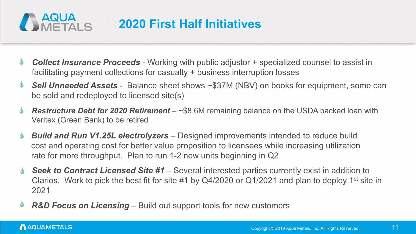 Electrolyzer V1.25L – Readying For Licensing Engineering team has been implementing minor improvements to the current electrolyzer design 1 Improved power distribution to improve electrical efficiency and operating cost 2 Tank profile changes to automate solid removal from the tank – run 90+ days 3 Reduce the complexity of custom components to reduce build cost 4 Improve robustness of critical components to improve utilization 5 Adding further datalogging / remote access capabilities for licensed units Allow for licensees to realize lower install cost (CAPEX) and lower operating cost (OPEX) 1 No changes will affect the process of electrowinning lead that was fully developed in 2019 First V1.25L electrolyzer is currently scheduled to be running in Q2 2020, barring critical component lead times Copyright © 2019 Aqua Metals, Inc. All Rights Reserved. 10