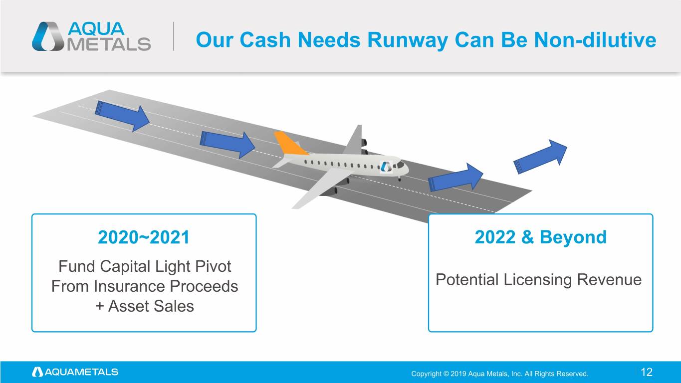 2020 First Half Initiatives Collect Insurance Proceeds - Working with public adjustor + specialized counsel to assist in facilitating payment collections for casualty + business interruption losses Sell Unneeded Assets - Balance sheet shows ~$37M (NBV) on books for equipment, some can be sold and redeployed to licensed site(s) Restructure Debt for 2020 Retirement – ~$8.6M remaining balance on the USDA backed loan with Veritex (Green Bank) to be retired Build and Run V1.25L electrolyzers – Designed improvements intended to reduce build cost and operating cost for better value proposition to licensees while increasing utilization rate for more throughput. Plan to run 1-2 new units beginning in Q2 Seek to Contract Licensed Site #1 – Several interested parties currently exist in addition to Clarios. Work to pick the best fit for site #1 by Q4/2020 or Q1/2021 and plan to deploy 1st site in 2021 R&D Focus on Licensing – Build out support tools for new customers Copyright © 2019 Aqua Metals, Inc. All Rights Reserved. 11