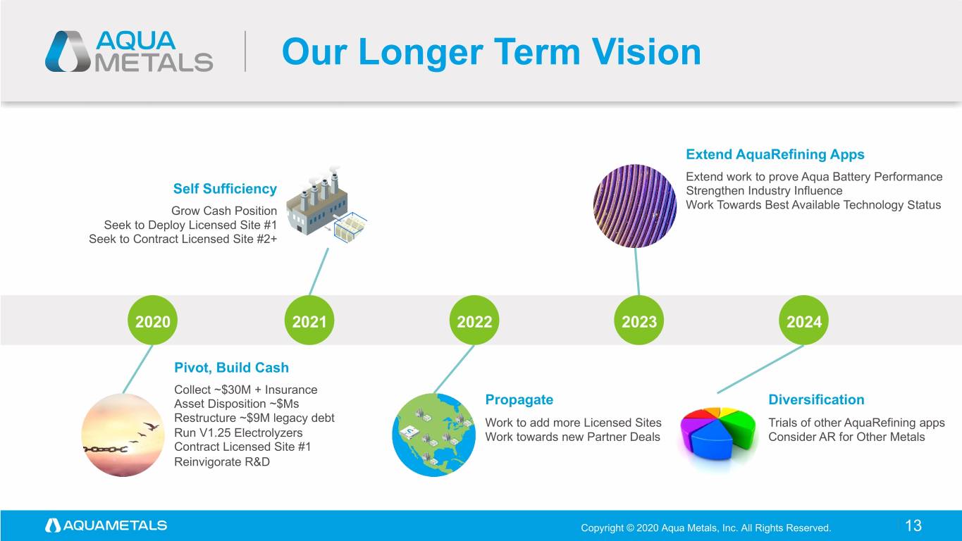 Our Cash Needs Runway Can Be Non-dilutive 2020~2021 2022 & Beyond Fund Capital Light Pivot From Insurance Proceeds Potential Licensing Revenue + Asset Sales Copyright © 2019 Aqua Metals, Inc. All Rights Reserved. 12