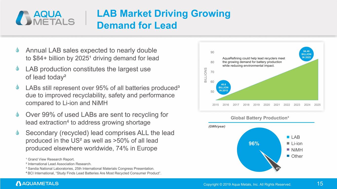 Market Drivers New High-Growth LAB Applications Require High-Purity Lead Auto growth in emerging Renewable energy Data Center & Telecom Electric Vehicles use markets - China, India and economy is growing and industries are growing lead batteries in addition South America Cars dependent on energy rapidly and utilize to Lithium-Ion to are using additional lead storage to be efficient lead batteries for support electronics batteries for start stop and effective backup power functionality Copyright © 2019 Aqua Metals, Inc. All Rights Reserved. 14
