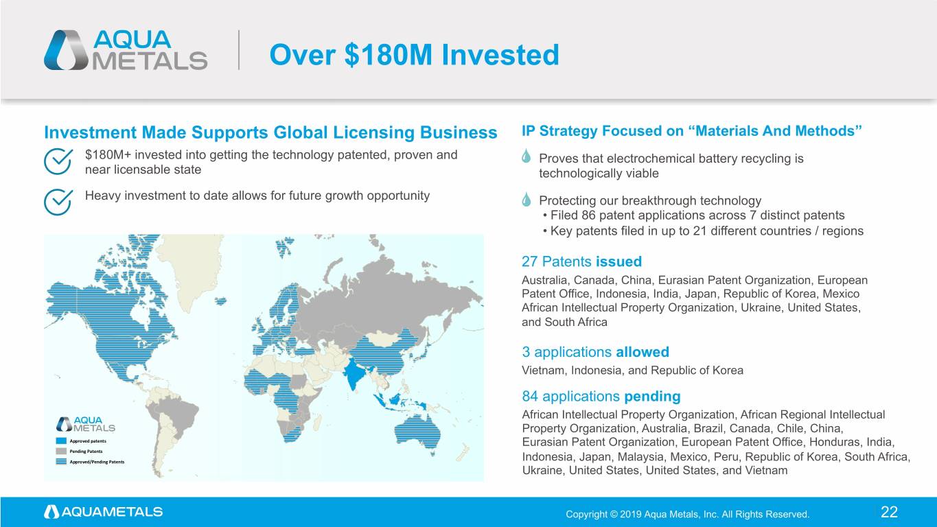 Licensing Market Opportunity Addressable Market based on 2018 Secondary lead production Secondary Lead Production 7,240,000 Tonnes Total Paste available for AquaRefining 3,600,000 Tonnes Total Addressable market ($2000.00 per T lead) $7,200,000,000 Source: Wood MacKenzie Copyright © 2019 Aqua Metals, Inc. All Rights Reserved. 21