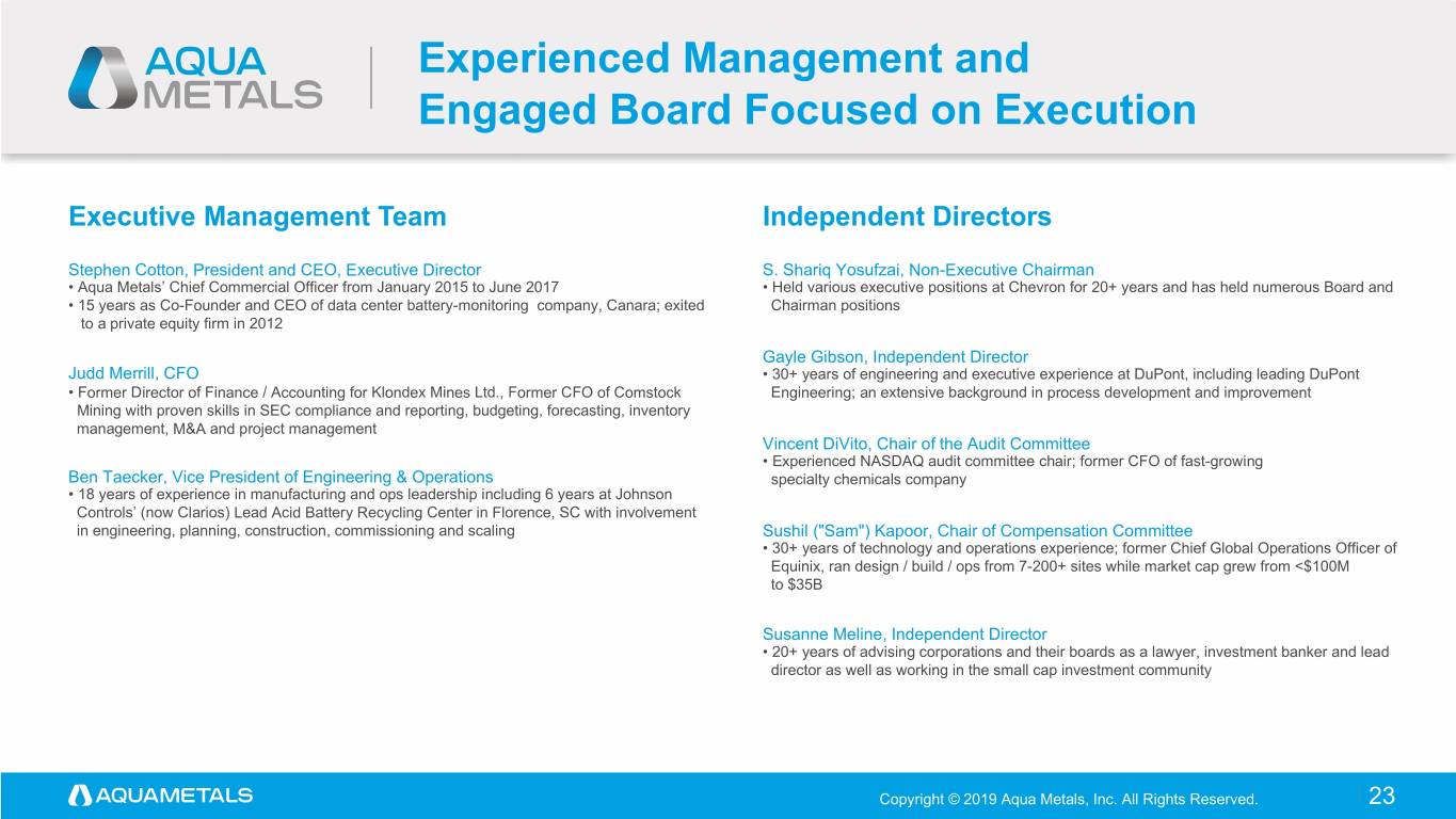 Experienced Management and Engaged Board Focused on Execution Executive Management Team Independent Directors Stephen Cotton, President and CEO, Executive Director S. Shariq Yosufzai, Non-Executive Chairman • Aqua Metals’ Chief Commercial Officer from January 2015 to June 2017 • Held various executive positions at Chevron for 20+ years and has held numerous Board and • 15 years as Co-Founder and CEO of data center battery-monitoring company, Canara; exited Chairman positions to a private equity firm in 2012 Gayle Gibson, Independent Director Judd Merrill, CFO • 30+ years of engineering and executive experience at DuPont, including leading DuPont • Former Director of Finance / Accounting for Klondex Mines Ltd., Former CFO of Comstock Engineering; an extensive background in process development and improvement Mining with proven skills in SEC compliance and reporting, budgeting, forecasting, inventory management, M&A and project management Vincent DiVito, Chair of the Audit Committee • Experienced NASDAQ audit committee chair; former CFO of fast-growing Ben Taecker, Vice President of Engineering & Operations specialty chemicals company • 18 years of experience in manufacturing and ops leadership including 6 years at Johnson Controls’ (now Clarios) Lead Acid Battery Recycling Center in Florence, SC with involvement in engineering, planning, construction, commissioning and scaling Sushil ("Sam") Kapoor, Chair of Compensation Committee • 30+ years of technology and operations experience; former Chief Global Operations Officer of Equinix, ran design / build / ops from 7-200+ sites while market cap grew from <$100M to $35B Susanne Meline, Independent Director • 20+ years of advising corporations and their boards as a lawyer, investment banker and lead director as well as working in the small cap investment community Copyright © 2019 Aqua Metals, Inc. All Rights Reserved. 23
