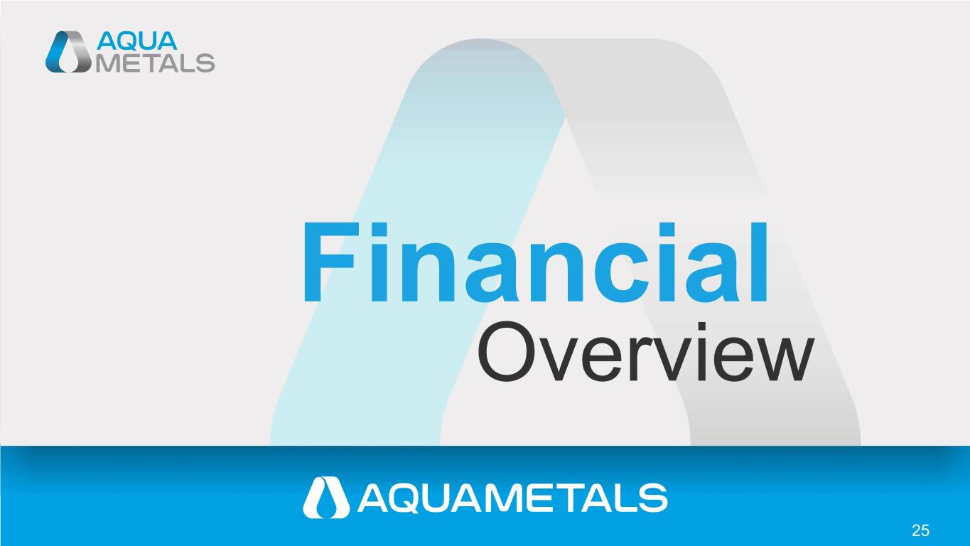 Aqua Metals - In Summary First of its kind environmentally friendly solution for lead acid battery recycling – producing 99.996% pure lead Company has proven AquaRefining at demonstration commercial scale which we believe is a catalyst to launch our global licensing business $20B+ and growing addressable global market, 50% of which can be licensed AquaRefining Strategic partnerships / investment from global leaders validate industry support Management team already executing and refining the business plan put in place in 2018; accelerated to capital light licensing opportunity post fire in early 2020 Copyright © 2019 Aqua Metals, Inc. All Rights Reserved. 24