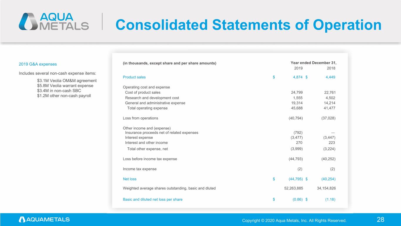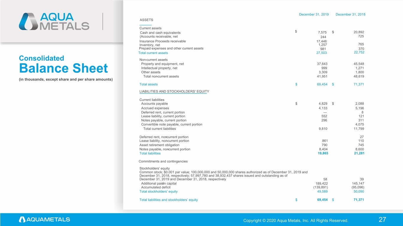 December 31, 2019 December 31, 2018 ASSETS Current assets Cash and cash equivalents $ 7,575 $ 20,892 (Accounts receivable, net 244 725 Insurance Proceeds receivable 17,446 Inventory, net 1,257 765 Prepaid expenses and other current assets 981 370 Total current assets 27,503 22,752 Consolidated Non-current assets Property and equipment, net 37,643 45,548 Intellectual property, net 999 1,271 Balance Sheet Other assets 3,309 1,800 Total non-current assets 41,951 48,619 (in thousands, except share and per share amounts) Total assets $ 69,454 $ 71,371 LIABILITIES AND STOCKHOLDERS’ EQUITY Current liabilities Accounts payable $ 4,829 $ 2,088 Accrued expenses 4,133 5,196 Deferred rent, current portion — 8 Lease liability, current portion 552 121 Notes payable, current portion 296 311 Convertible note payable, current portion 4,075 Total current liabilities 9,810 11,799 Deferred rent, non-current portion 27 Lease liability, non-current portion 861 110 Asset retirement obligation 790 745 Notes payable, non-current portion 8,404 8,600 Total liabilities 19,865 21,281 Commitments and contingencies Stockholders’ equity Common stock; $0.001 par value; 100,000,000 and 50,000,000 shares authorized as of December 31, 2019 and December 31, 2018, respectively; 57,997,780 and 38,932,437 shares issued and outstanding as of December 31, 2019 and December 31, 2018, respectively 58 39 Additional paid-in capital 189,422 145,147 Accumulated deficit (139,891) (95,096) Total stockholders’ equity 49,589 50,090 Total liabilities and stockholders’ equity $ 69,454 $ 71,371 Copyright © 2020 Aqua Metals, Inc. All Rights Reserved. 27