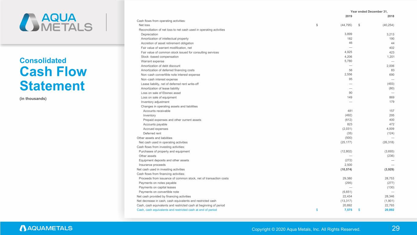 Year ended December 31, 2019 2018 Cash flows from operating activities: Net loss $ (44,795) $ (40,254) Reconciliation of net loss to net cash used in operating activities Depreciation 3,899 3,213 Amortization of intellectual property 182 190 Accretion of asset retirement obligation 46 44 Fair value of warrant modification, net — 402 Fair value of common stock issued for consulting services 4,925 423 Stock -based compensation 4,206 1,201 Consolidated Warrant expense 5,780 — Amortization of debt discount — 2,006 Amortization of deferred financing costs 56 83 Cash Flow Non -cash convertible note interest expense 2,556 690 Non -cash interest expense 95 — Lease liability, net of deferred rent write-off — (493) Statement Amortization of lease liability — (80) Loss on sale of Ebonex asset 90 — (in thousands) Loss on sale of equipment 149 869 Inventory adjustment — 179 Changes in operating assets and liabilities Accounts receivable 481 157 Inventory (492) 295 Prepaid expenses and other current assets (612) 400 Accounts payable 823 472 Accrued expenses (2,031) 4,009 Deferred rent (35) (124) Other assets and liabilities (500) — Net cash used in operating activities (25,177) (26,318) Cash flows from investing activities: Purchases of property and equipment (12,802) (3,693) Other assets — (236) Equipment deposits and other assets (272) — Insurance proceeds 2,500 — Net cash used in investing activities (10,574) (3,929) Cash flows from financing activities: Proceeds from issuance of common stock, net of transaction costs 29,380 28,753 Payments on notes payable (295) (277) Payments on capital leases — (130) Payments on convertible note (6,651) — Net cash provided by financing activities 22,434 28,346 Net decrease in cash, cash equivalents and restricted cash (13,317) (1,901) Cash, cash equivalents and restricted cash at beginning of period 20,892 22,793 Cash, cash equivalents and restricted cash at end of period $ 7,575 $ 20,892 Copyright © 2020 Aqua Metals, Inc. All Rights Reserved. 29