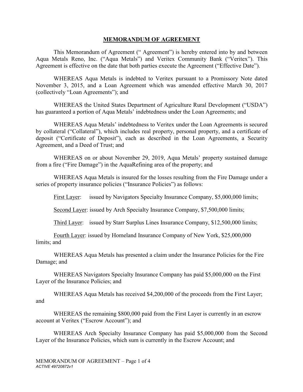 MEMORANDUM OF AGREEMENT This Memorandum of Agreement (“ Agreement”) is hereby entered into by and between Aqua Metals Reno, Inc. (“Aqua Metals”) and Veritex Community Bank (“Veritex”). This Agreement is effective on the date that both parties execute the Agreement (“Effective Date”). WHEREAS Aqua Metals is indebted to Veritex pursuant to a Promissory Note dated November 3, 2015, and a Loan Agreement which was amended effective March 30, 2017 (collectively “Loan Agreements”); and WHEREAS the United States Department of Agriculture Rural Development (“USDA”) has guaranteed a portion of Aqua Metals’ indebtedness under the Loan Agreements; and WHEREAS Aqua Metals’ indebtedness to Veritex under the Loan Agreements is secured by collateral (“Collateral”), which includes real property, personal property, and a certificate of deposit (“Certificate of Deposit”), each as described in the Loan Agreements, a Security Agreement, and a Deed of Trust; and WHEREAS on or about November 29, 2019, Aqua Metals’ property sustained damage from a fire (“Fire Damage”) in the AquaRefining area of the property; and WHEREAS Aqua Metals is insured for the losses resulting from the Fire Damage under a series of property insurance policies (“Insurance Policies”) as follows: First Layer: issued by Navigators Specialty Insurance Company, $5,000,000 limits; Second Layer: issued by Arch Specialty Insurance Company, $7,500,000 limits; Third Layer: issued by Starr Surplus Lines Insurance Company, $12,500,000 limits; Fourth Layer: issued by Homeland Insurance Company of New York, $25,000,000 limits; and WHEREAS Aqua Metals has presented a claim under the Insurance Policies for the Fire Damage; and WHEREAS Navigators Specialty Insurance Company has paid $5,000,000 on the First Layer of the Insurance Policies; and WHEREAS Aqua Metals has received $4,200,000 of the proceeds from the First Layer; and WHEREAS the remaining $800,000 paid from the First Layer is currently in an escrow account at Veritex (“Escrow Account”); and WHEREAS Arch Specialty Insurance Company has paid $5,000,000 from the Second Layer of the Insurance Policies, which sum is currently in the Escrow Account; and MEMORANDUM OF AGREEMENT – Page 1 of 4 ACTIVE 49720872v1