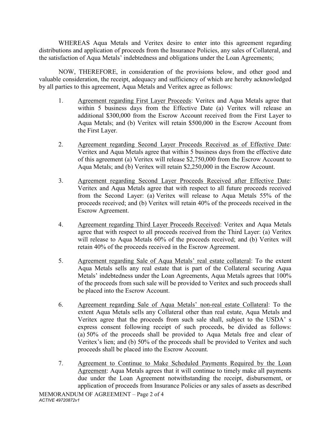 WHEREAS Aqua Metals and Veritex desire to enter into this agreement regarding distributions and application of proceeds from the Insurance Policies, any sales of Collateral, and the satisfaction of Aqua Metals’ indebtedness and obligations under the Loan Agreements; NOW, THEREFORE, in consideration of the provisions below, and other good and valuable consideration, the receipt, adequacy and sufficiency of which are hereby acknowledged by all parties to this agreement, Aqua Metals and Veritex agree as follows: 1. Agreement regarding First Layer Proceeds: Veritex and Aqua Metals agree that within 5 business days from the Effective Date (a) Veritex will release an additional $300,000 from the Escrow Account received from the First Layer to Aqua Metals; and (b) Veritex will retain $500,000 in the Escrow Account from the First Layer. 2. Agreement regarding Second Layer Proceeds Received as of Effective Date: Veritex and Aqua Metals agree that within 5 business days from the effective date of this agreement (a) Veritex will release $2,750,000 from the Escrow Account to Aqua Metals; and (b) Veritex will retain $2,250,000 in the Escrow Account. 3. Agreement regarding Second Layer Proceeds Received after Effective Date: Veritex and Aqua Metals agree that with respect to all future proceeds received from the Second Layer: (a) Veritex will release to Aqua Metals 55% of the proceeds received; and (b) Veritex will retain 40% of the proceeds received in the Escrow Agreement. 4. Agreement regarding Third Layer Proceeds Received: Veritex and Aqua Metals agree that with respect to all proceeds received from the Third Layer: (a) Veritex will release to Aqua Metals 60% of the proceeds received; and (b) Veritex will retain 40% of the proceeds received in the Escrow Agreement. 5. Agreement regarding Sale of Aqua Metals’ real estate collateral: To the extent Aqua Metals sells any real estate that is part of the Collateral securing Aqua Metals’ indebtedness under the Loan Agreements, Aqua Metals agrees that 100% of the proceeds from such sale will be provided to Veritex and such proceeds shall be placed into the Escrow Account. 6. Agreement regarding Sale of Aqua Metals’ non-real estate Collateral: To the extent Aqua Metals sells any Collateral other than real estate, Aqua Metals and Veritex agree that the proceeds from such sale shall, subject to the USDA’ s express consent following receipt of such proceeds, be divided as follows: (a) 50% of the proceeds shall be provided to Aqua Metals free and clear of Veritex’s lien; and (b) 50% of the proceeds shall be provided to Veritex and such proceeds shall be placed into the Escrow Account. 7. Agreement to Continue to Make Scheduled Payments Required by the Loan Agreement: Aqua Metals agrees that it will continue to timely make all payments due under the Loan Agreement notwithstanding the receipt, disbursement, or application of proceeds from Insurance Policies or any sales of assets as described MEMORANDUM OF AGREEMENT – Page 2 of 4 ACTIVE 49720872v1