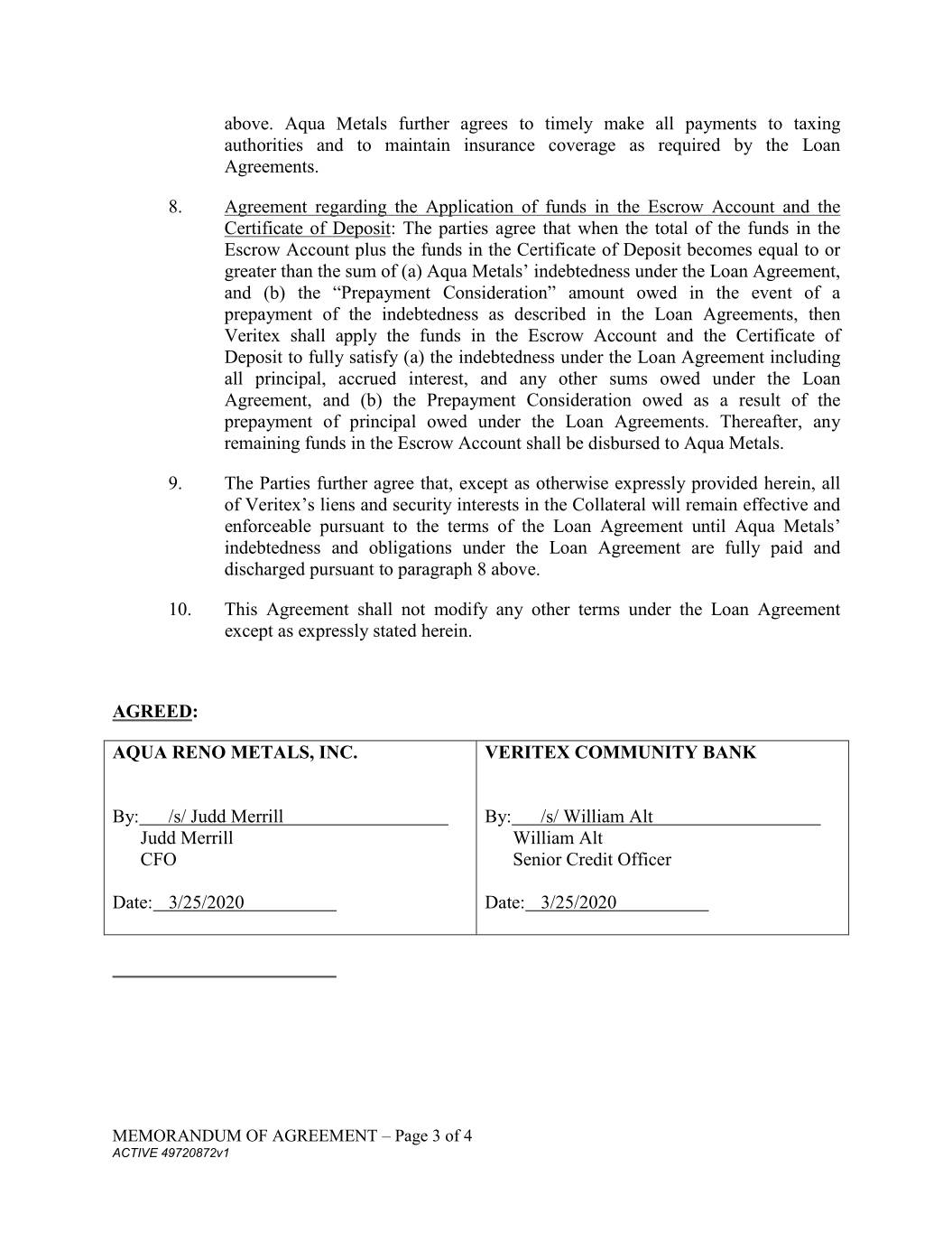 above. Aqua Metals further agrees to timely make all payments to taxing authorities and to maintain insurance coverage as required by the Loan Agreements. 8. Agreement regarding the Application of funds in the Escrow Account and the Certificate of Deposit: The parties agree that when the total of the funds in the Escrow Account plus the funds in the Certificate of Deposit becomes equal to or greater than the sum of (a) Aqua Metals’ indebtedness under the Loan Agreement, and (b) the “Prepayment Consideration” amount owed in the event of a prepayment of the indebtedness as described in the Loan Agreements, then Veritex shall apply the funds in the Escrow Account and the Certificate of Deposit to fully satisfy (a) the indebtedness under the Loan Agreement including all principal, accrued interest, and any other sums owed under the Loan Agreement, and (b) the Prepayment Consideration owed as a result of the prepayment of principal owed under the Loan Agreements. Thereafter, any remaining funds in the Escrow Account shall be disbursed to Aqua Metals. 9. The Parties further agree that, except as otherwise expressly provided herein, all of Veritex’s liens and security interests in the Collateral will remain effective and enforceable pursuant to the terms of the Loan Agreement until Aqua Metals’ indebtedness and obligations under the Loan Agreement are fully paid and discharged pursuant to paragraph 8 above. 10. This Agreement shall not modify any other terms under the Loan Agreement except as expressly stated herein. AGREED: AQUA RENO METALS, INC. VERITEX COMMUNITY BANK By: /s/ Judd Merrill By: /s/ William Alt Judd Merrill William Alt CFO Senior Credit Officer Date: 3/25/2020 Date: 3/25/2020 MEMORANDUM OF AGREEMENT – Page 3 of 4 ACTIVE 49720872v1