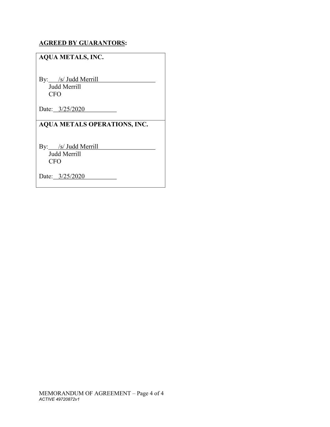 AGREED BY GUARANTORS: AQUA METALS, INC. By: /s/ Judd Merrill Judd Merrill CFO Date: 3/25/2020 AQUA METALS OPERATIONS, INC. By: /s/ Judd Merrill Judd Merrill CFO Date: 3/25/2020 MEMORANDUM OF AGREEMENT – Page 4 of 4 ACTIVE 49720872v1