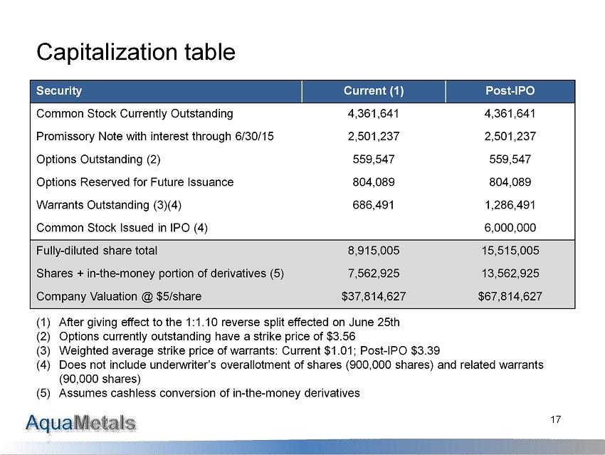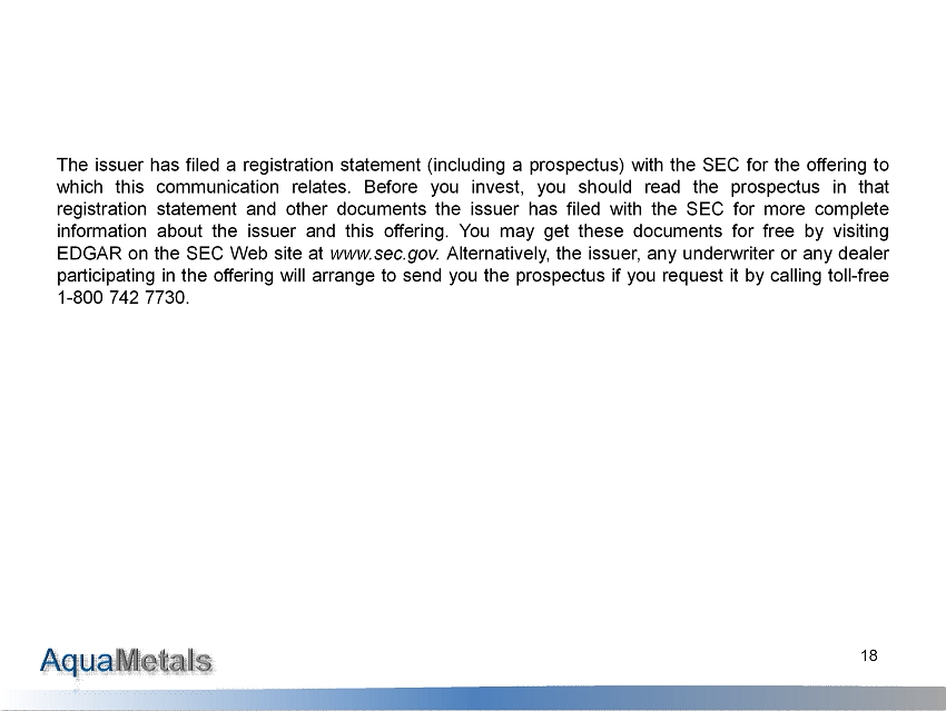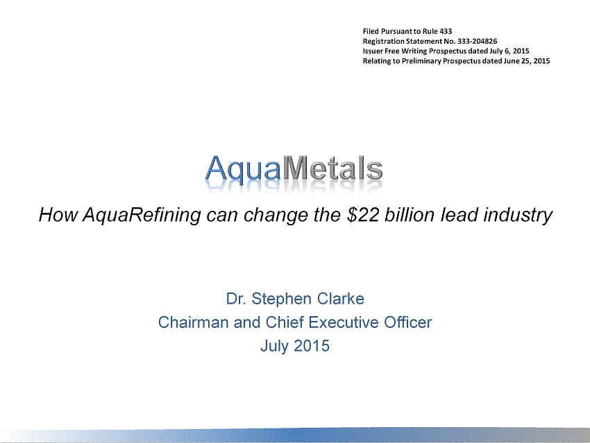 How AquaRefining can change the $22 billion lead industry Dr. Stephen Clarke Chairman and Chief Executive Officer July 2015 Filed Pursuant to Rule 433 Registration Statement No. 333 - 204826 Issuer Free Writing Prospectus dated July 6, 2015 Relating to Preliminary Prospectus dated June 25, 2015