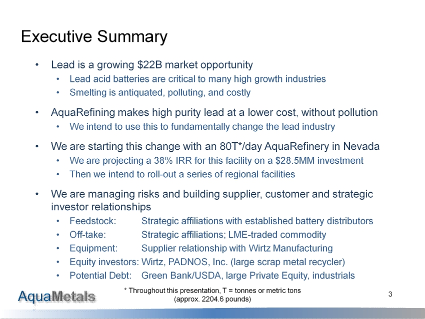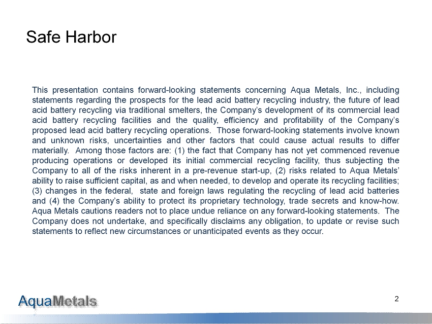 This presentation contains forward - looking statements concerning Aqua Metals, Inc . , including statements regarding the prospects for the lead acid battery recycling industry, the future of lead acid battery recycling via traditional smelters, the Company’s development of its commercial lead acid battery recycling facilities and the quality, efficiency and profitability of the Company’s proposed lead acid battery recycling operations . Those forward - looking statements involve known and unknown risks, uncertainties and other factors that could cause actual results to differ materially . Among those factors are : ( 1 ) the fact that Company has not yet commenced revenue producing operations or developed its initial commercial recycling facility, thus subjecting the Company to all of the risks inherent in a pre - revenue start - up, ( 2 ) risks related to Aqua Metals’ ability to raise sufficient capital, as and when needed, to develop and operate its recycling facilities ; ( 3 ) changes in the federal, state and foreign laws regulating the recycling of lead acid batteries and ( 4 ) the Company’s ability to protect its proprietary technology, trade secrets and know - how . Aqua Metals cautions readers not to place undue reliance on any forward - looking statements . The Company does not undertake, and specifically disclaims any obligation, to update or revise such statements to reflect new circumstances or unanticipated events as they occur . 2 Safe Harbor