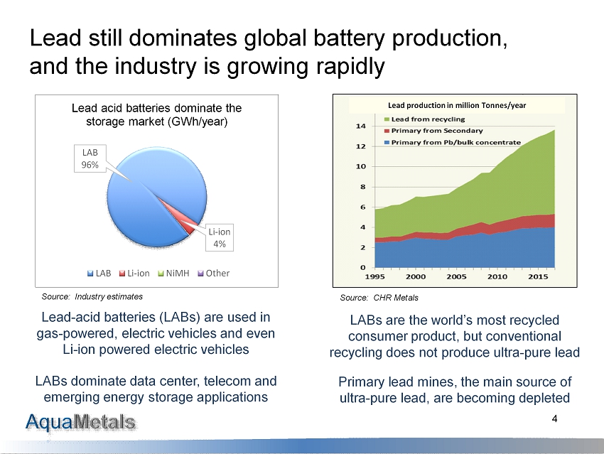 3 Executive Summary • Lead is a growing $22B market opportunity • Lead acid batteries are critical to many high growth industries • Smelting is antiquated, polluting, and costly • AquaRefining makes high purity lead at a lower cost, without pollution • We intend to use this to fundamentally change the lead industry • We are starting this change with an 80T*/day AquaRefinery in Nevada • We are projecting a 38% IRR for this facility on a $28.5MM investment • Then we intend to roll - out a series of regional facilities • We are managing risks and building supplier, customer and strategic investor relationships • Feedstock: Strategic affiliations with established battery distributors • Off - take: Strategic affiliations; LME - traded commodity • Equipment: Supplier relationship with Wirtz Manufacturing • Equity investors: Wirtz, PADNOS, Inc. (large scrap metal recycler ) • Potential Debt: Green Bank/USDA, large Private Equity, industrials * Throughout this presentation, T = tonnes or metric tons (approx. 2204.6 pounds)