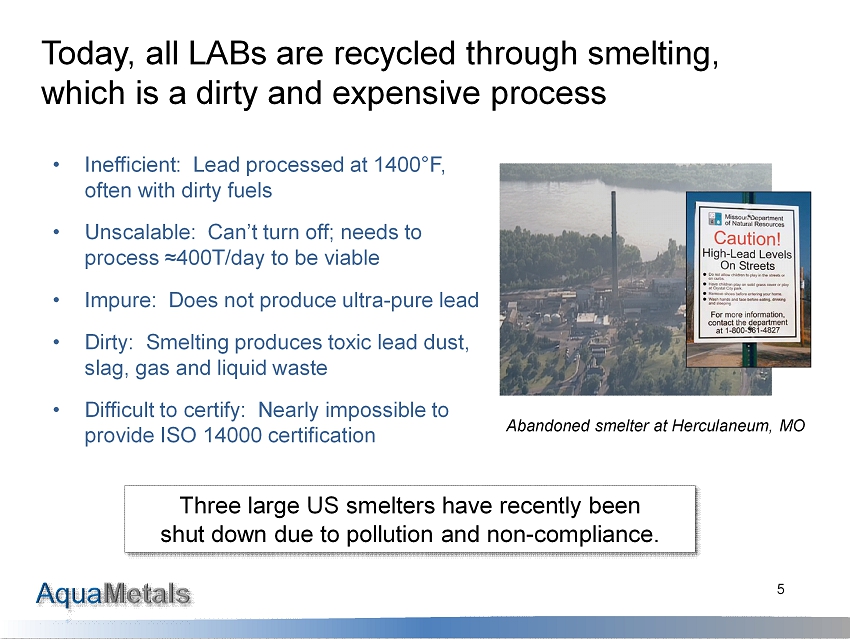 LAB 96% Li - ion 4% Lead acid batteries dominate the storage market ( GWh /year) LAB Li-ion NiMH Other LABs are the world’s most recycled consumer product, but conventional recycling does not produce ultra - pure lead Primary lead mines, the main source of ultra - pure lead, are becoming depleted Lead still dominates global battery production, and the industry is growing rapidly Lead - acid batteries (LABs) are used in gas - powered, electric vehicles and even Li - ion powered electric vehicles LABs dominate data center, telecom and emerging energy storage applications 4 Source: Industry estimates Source: CHR Metals Lead production in million Tonnes/year