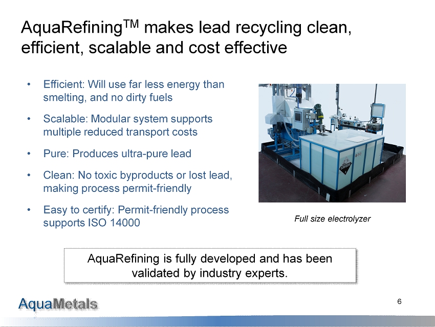 5 Today, all LABs are recycled through smelting, which is a dirty and expensive process Three large US smelters have recently been shut down due to pollution and non - compliance. • Inefficient: Lead processed at 1400 F, often with dirty fuels • Unscalable: Can’t turn off; needs to process ≈400T/day to be viable • Impure: Does not produce ultra - pure lead • Dirty: Smelting produces toxic lead dust, slag, gas and liquid waste • Difficult to certify: Nearly impossible to provide ISO 14000 certification Abandoned smelter at Herculaneum, MO