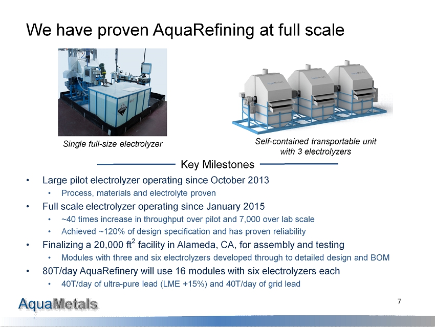 6 AquaRefining TM makes lead recycling clean, efficient, scalable and cost effective • Efficient: Will use far less energy than smelting, and no dirty fuels • Scalable: Modular system supports multiple reduced transport costs • Pure: Produces ultra - pure lead • Clean: No toxic byproducts or lost lead, making process permit - friendly • Easy to certify: Permit - friendly process supports ISO 14000 Full size electrolyzer AquaRefining is fully developed and has been validated by industry experts.